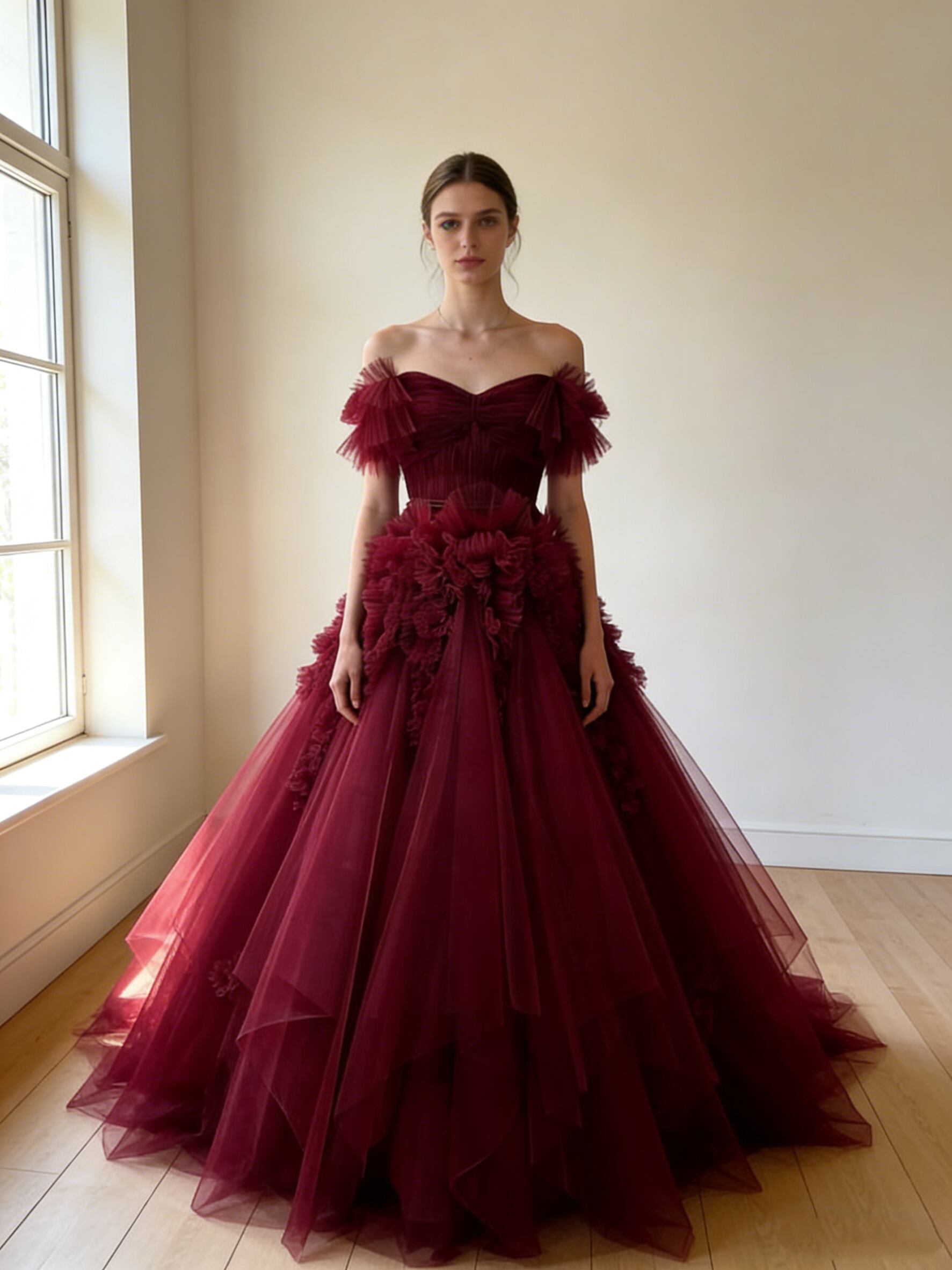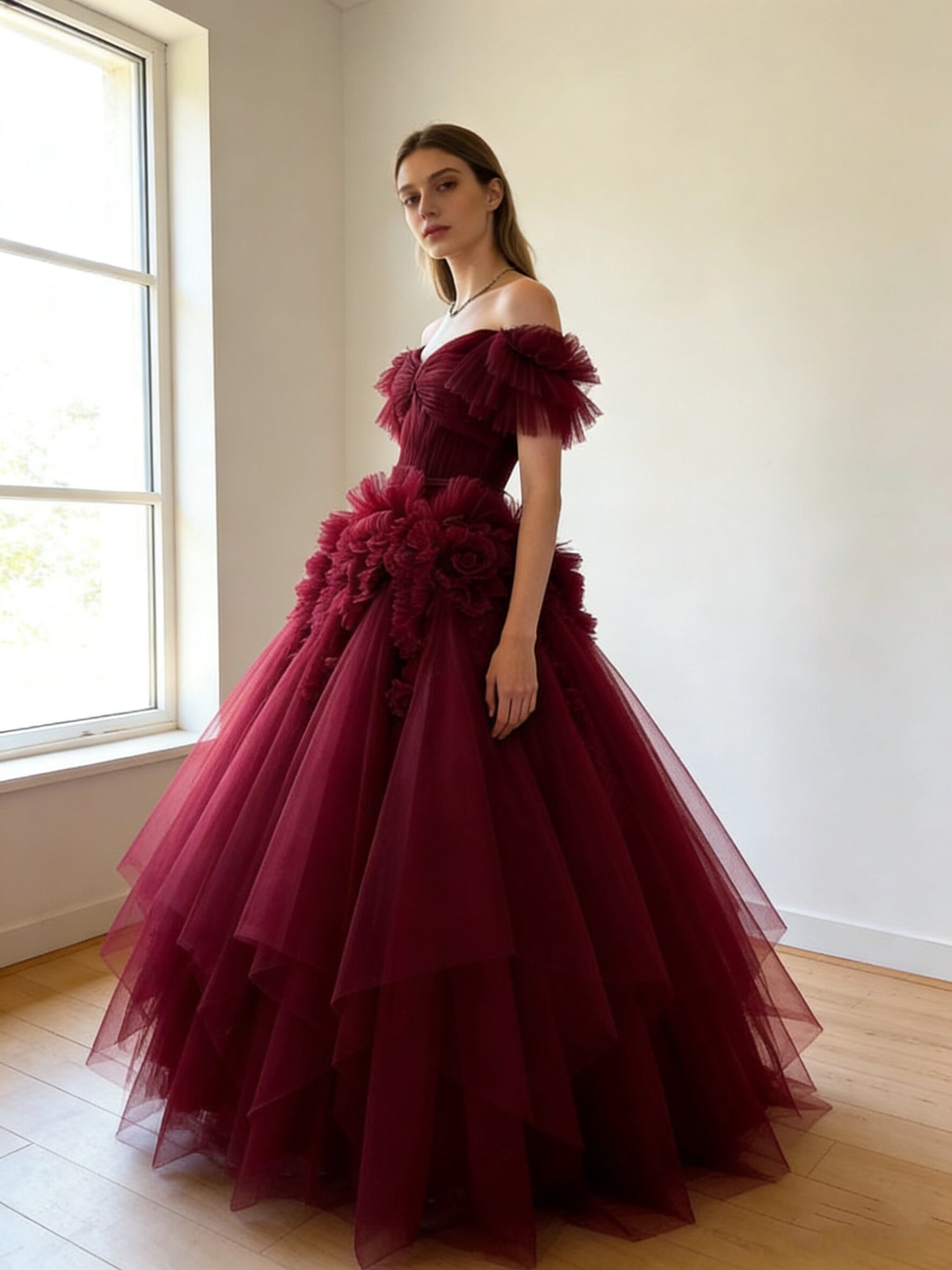 カラードレス ボルドー色 アシンメトリードレス オフショルダー ロング ふわふわドレス 結婚式/披露宴