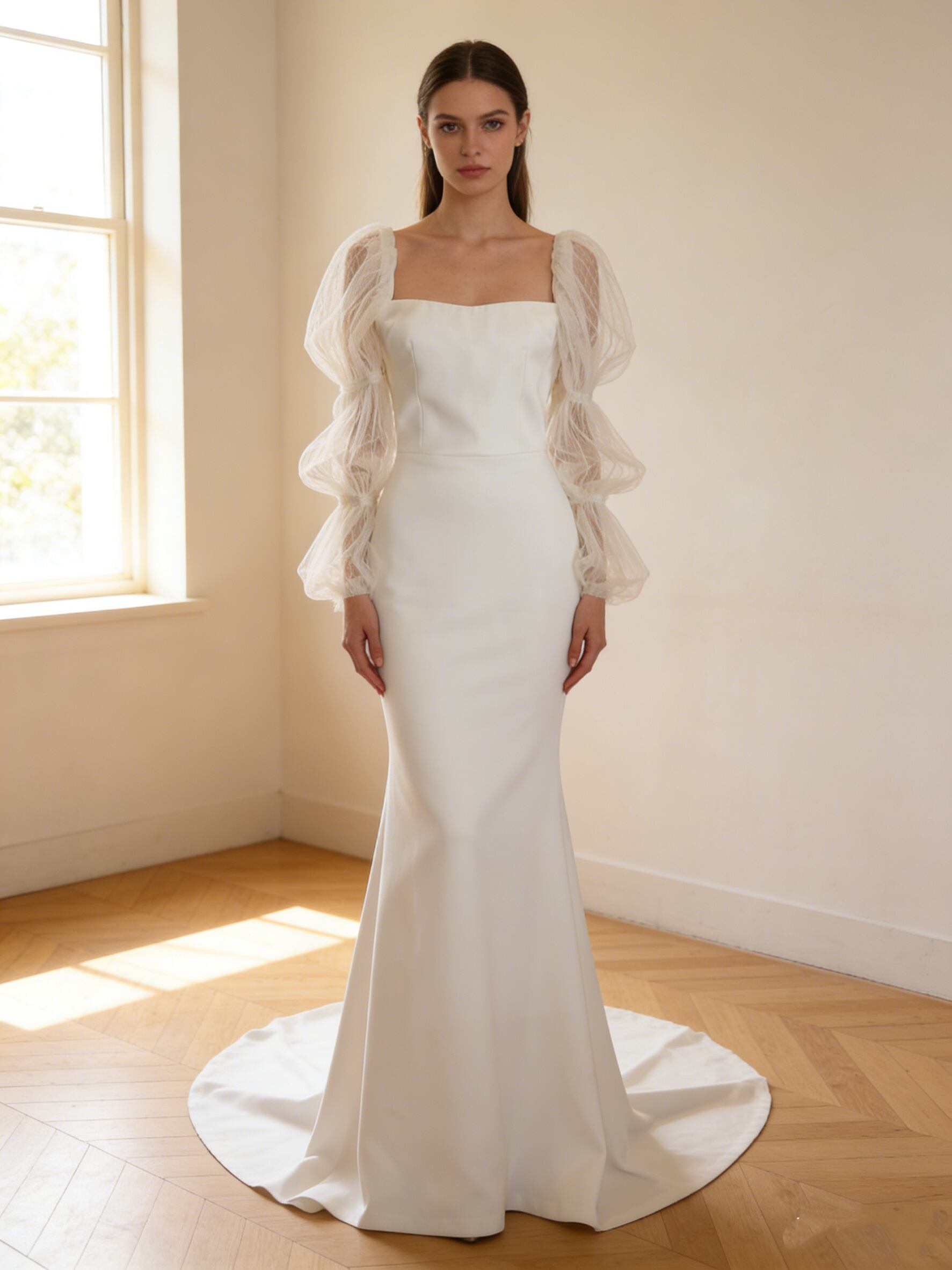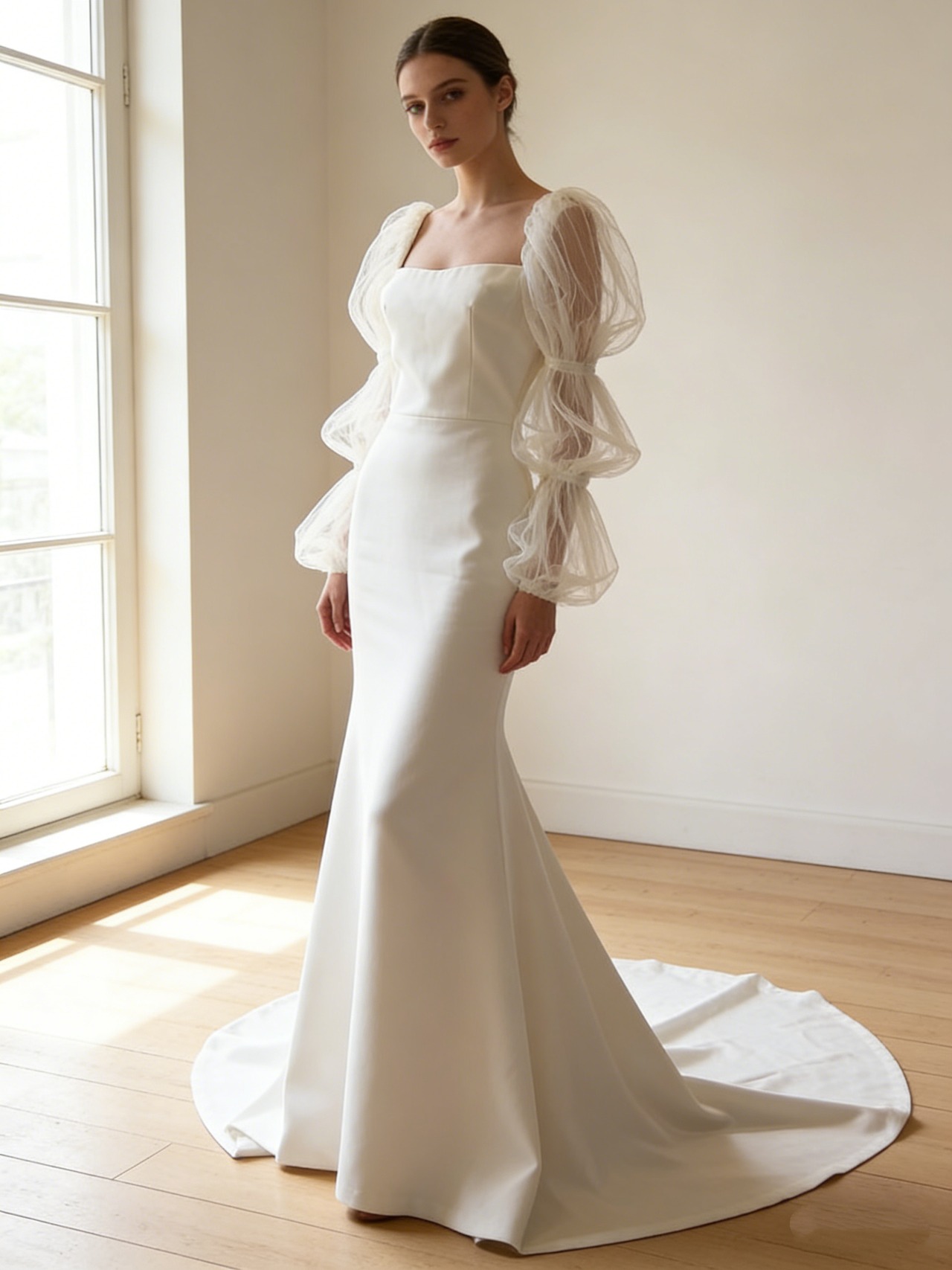 パーティードレス ロングスリーブ マーメイドライン クレープ生地 パフスリーブ スクエアネック 二次会
