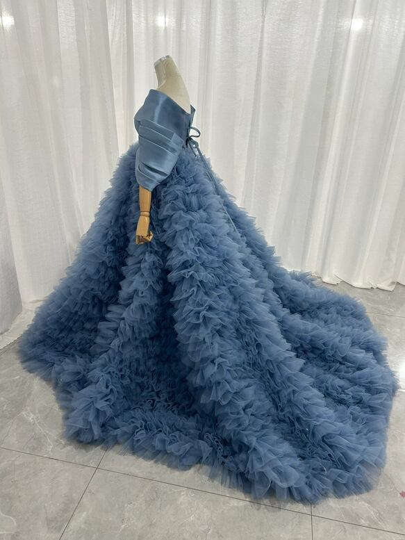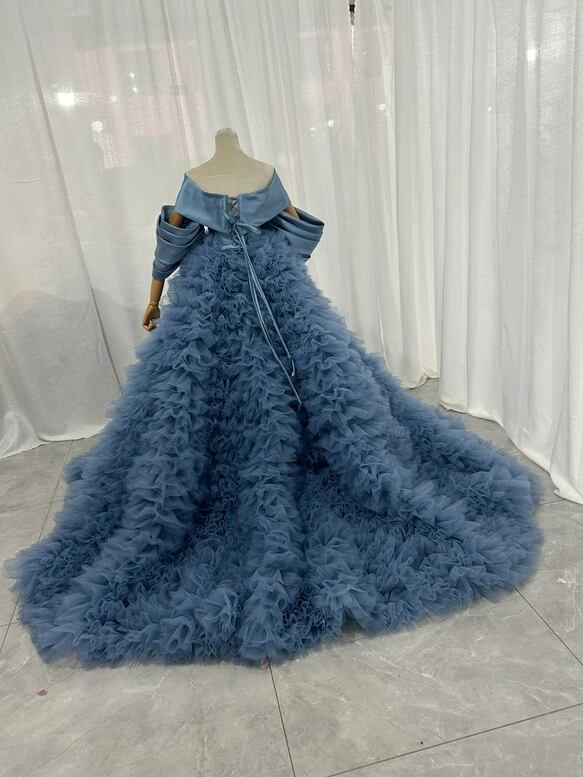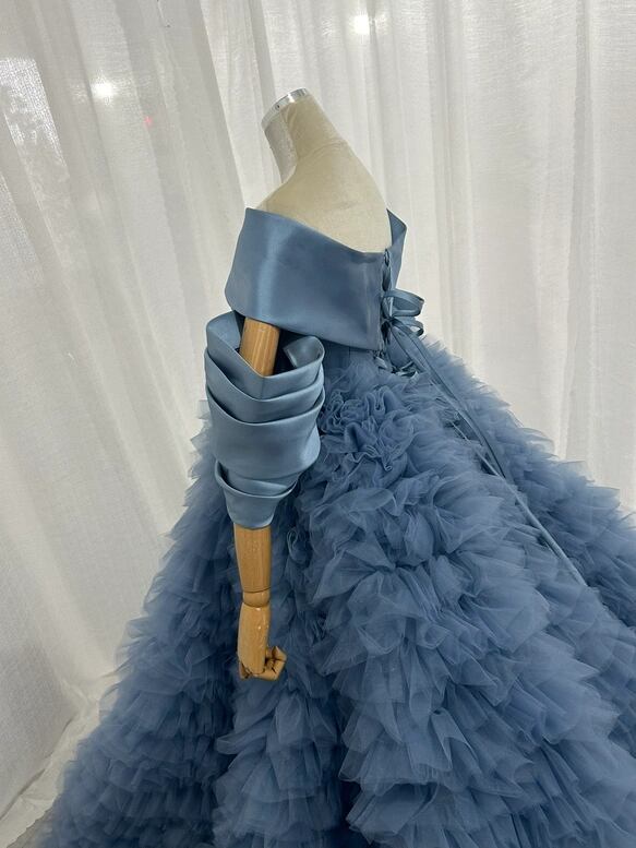 人気上昇! ブルーグレー ミカドサテン 取り外オフショルダー カラードレス取り外し袖フレアスカート挙式/前撮り