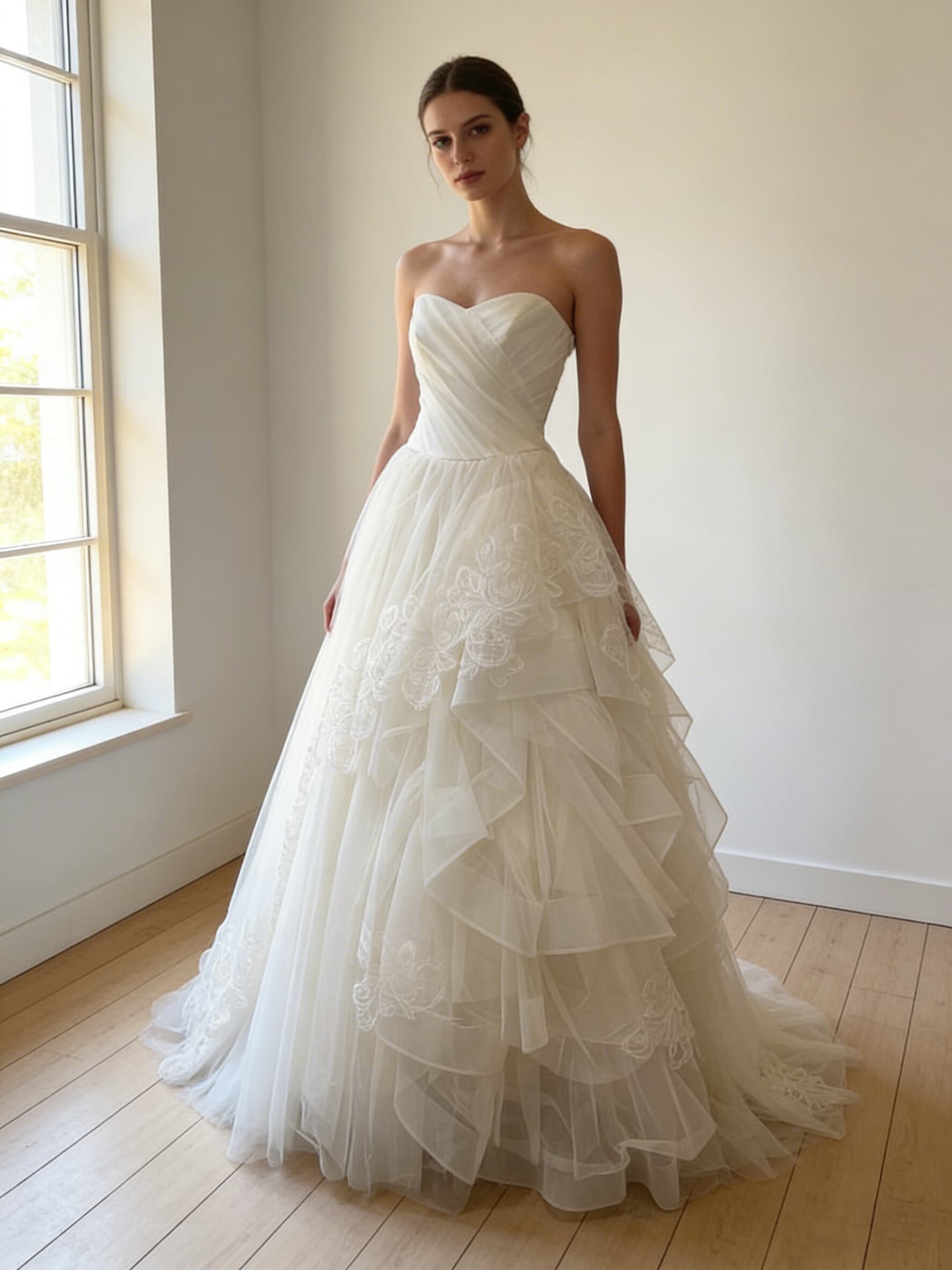 ウェディングドレス ビスチェドレス ラッフルフリル アシンメトリードレス 流れる透け花レース 結婚式