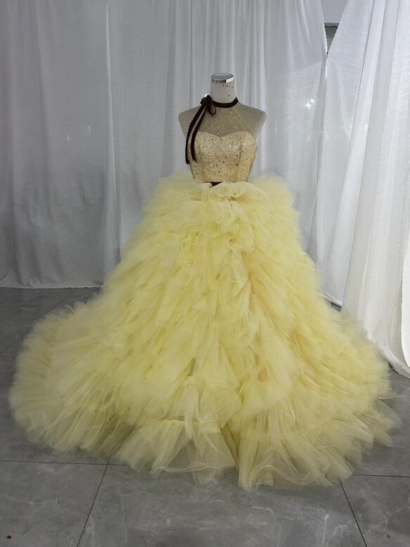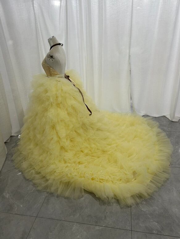 もこもこ イエロー キラキラチュール カラードレス チュールドレス フリルオフショルダー ふわふわ ボリュームドレス