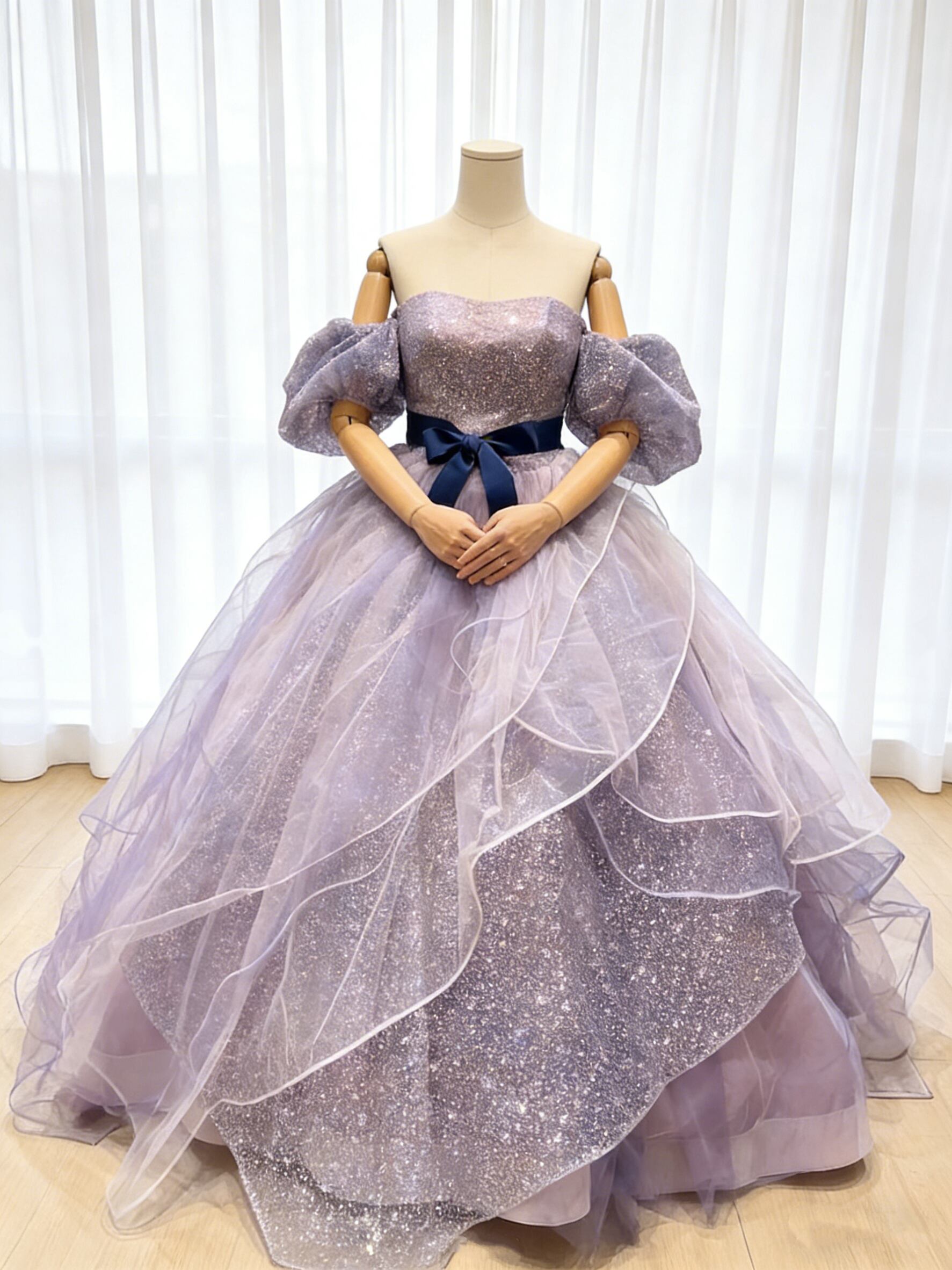 カラードレス パープル プリンセスライン パフスリーブドレス キラキラグリッターチュール サッシュベルト 結婚式/披露宴