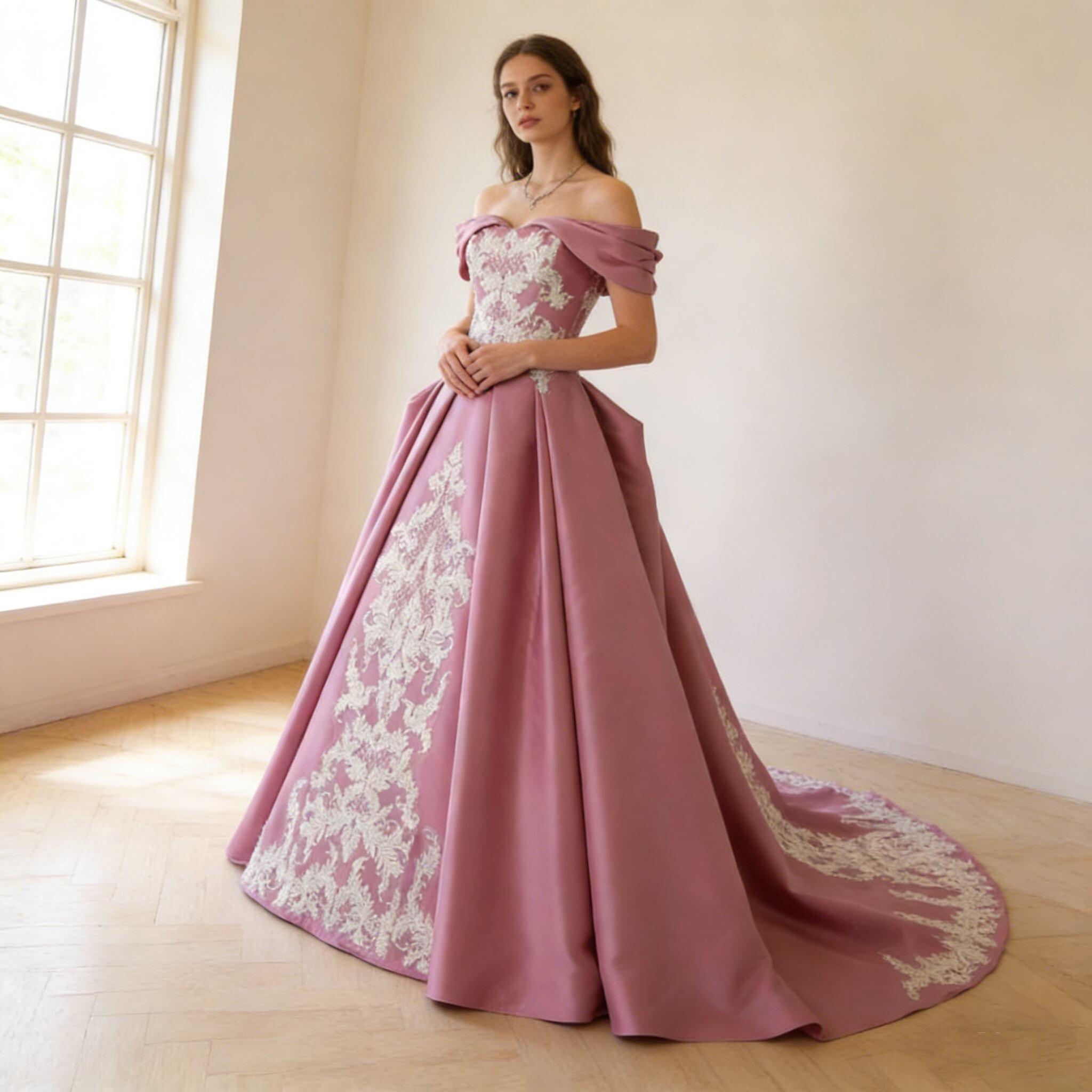 カラードレス オフショルダー ラベンダーピンク 魅惑の花レース ビスチェドレス 光沢サテン 結婚式