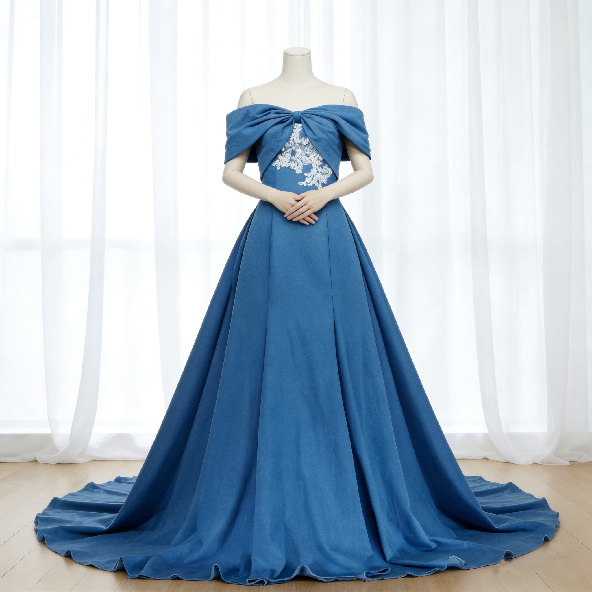 カラードレス デニムドレス オフショルダー 細見えシルエット ブルー 前撮り Aライン 結婚式/披露宴