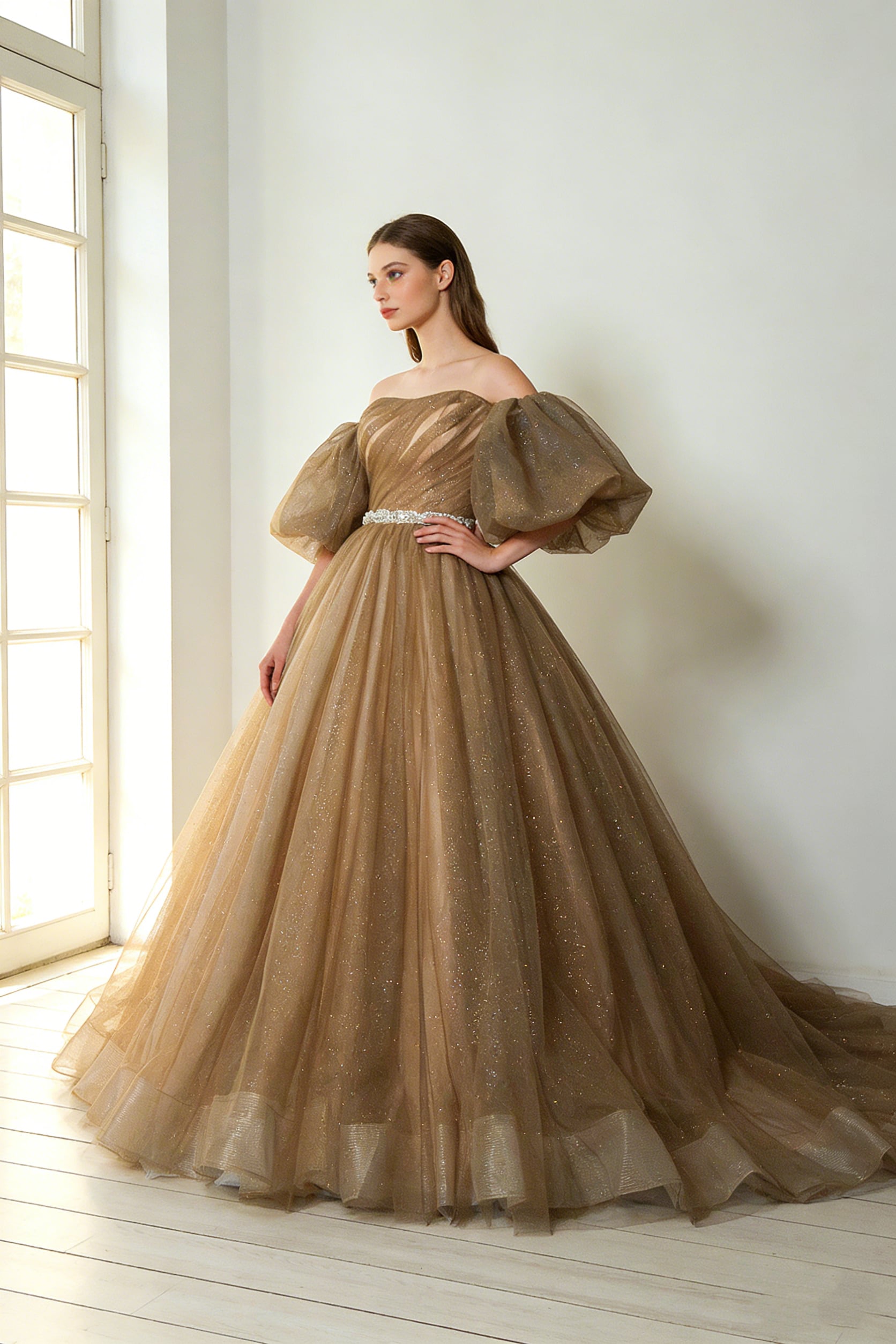 カラードレス シャンパン色 パフスリーブドレス キラキラチュール 抜群におしゃれ度が際立つ エアリー感