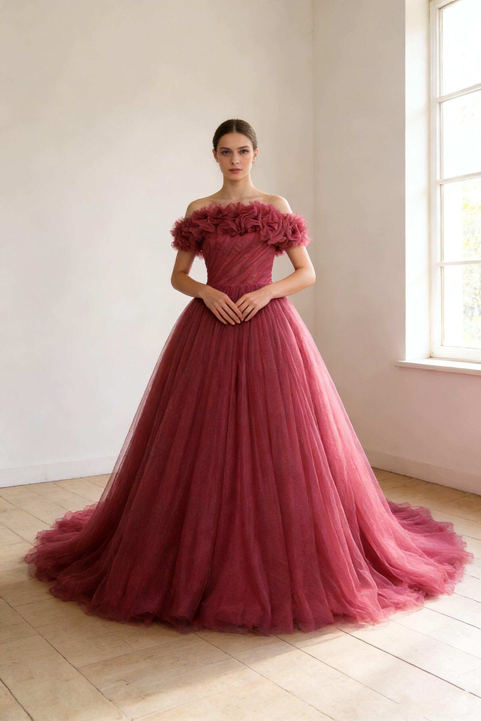 カラードレス ビビッドピンク ソフトチュール フレアスカート 取り外し可能なオフショルダー プリンセスライン
