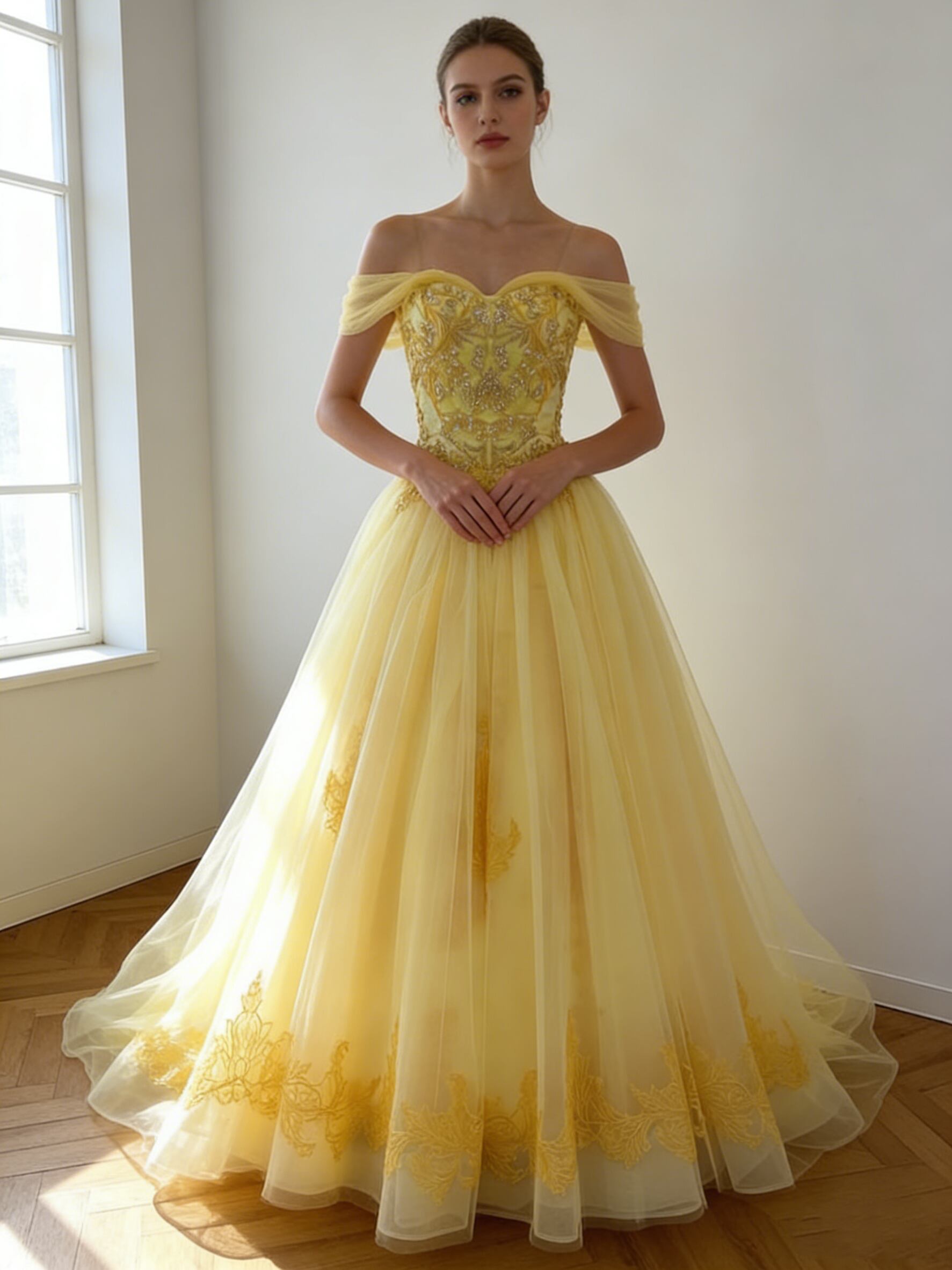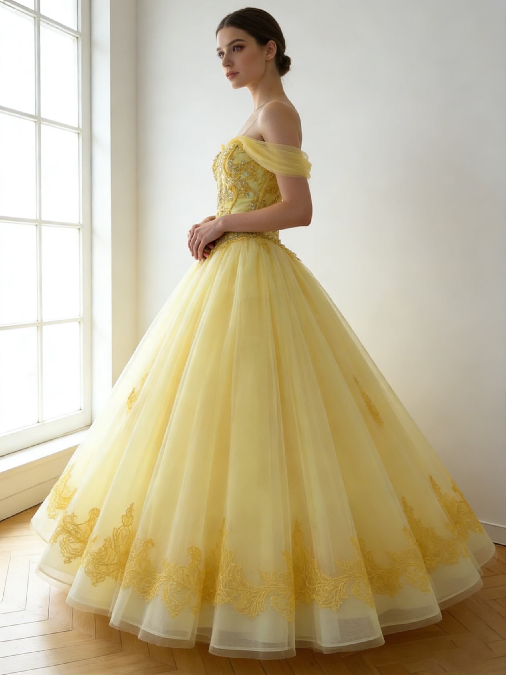 カラードレス オフショルダー 裾に繊細なレースをあしらった エレガント イエロー ブライダル ピアノ演奏会