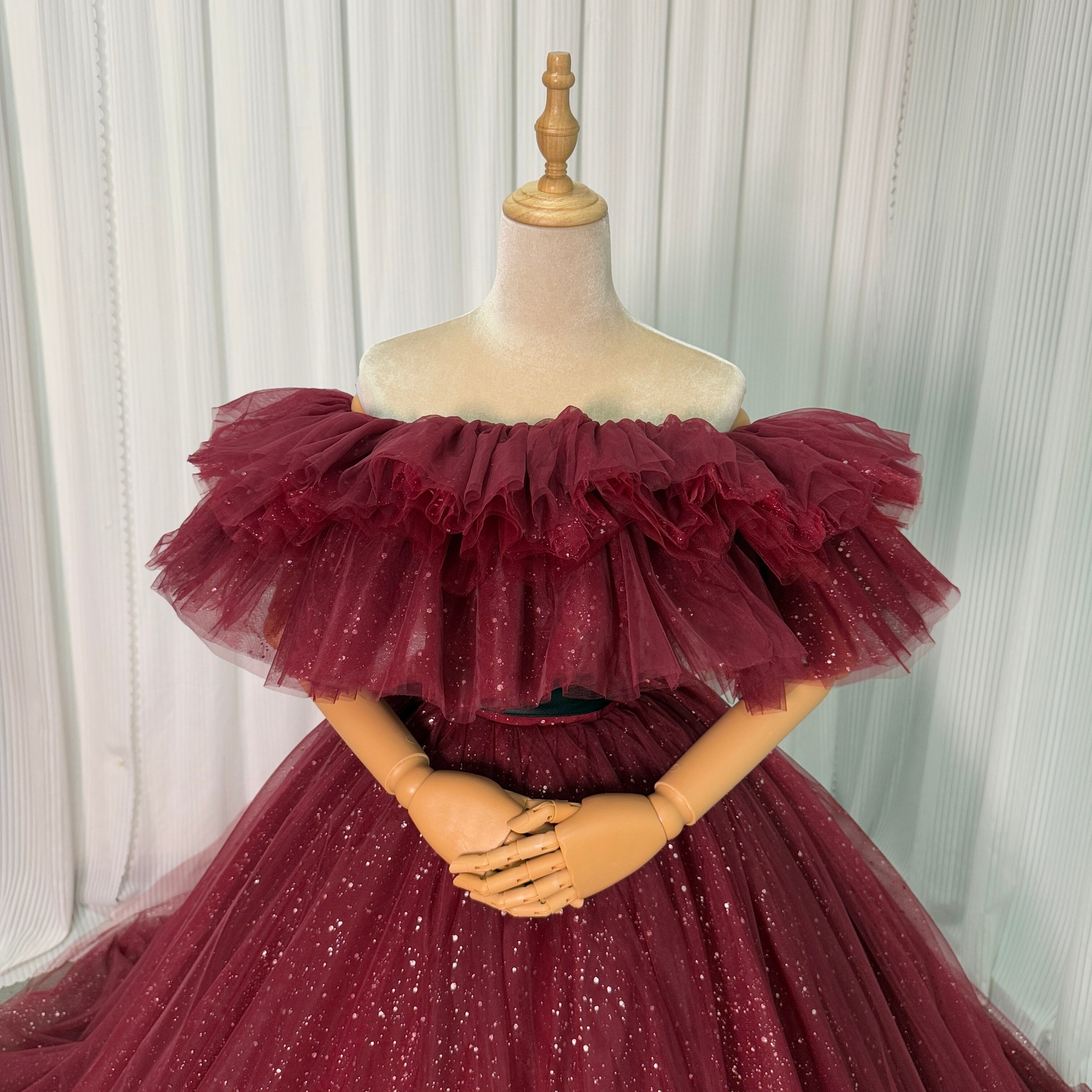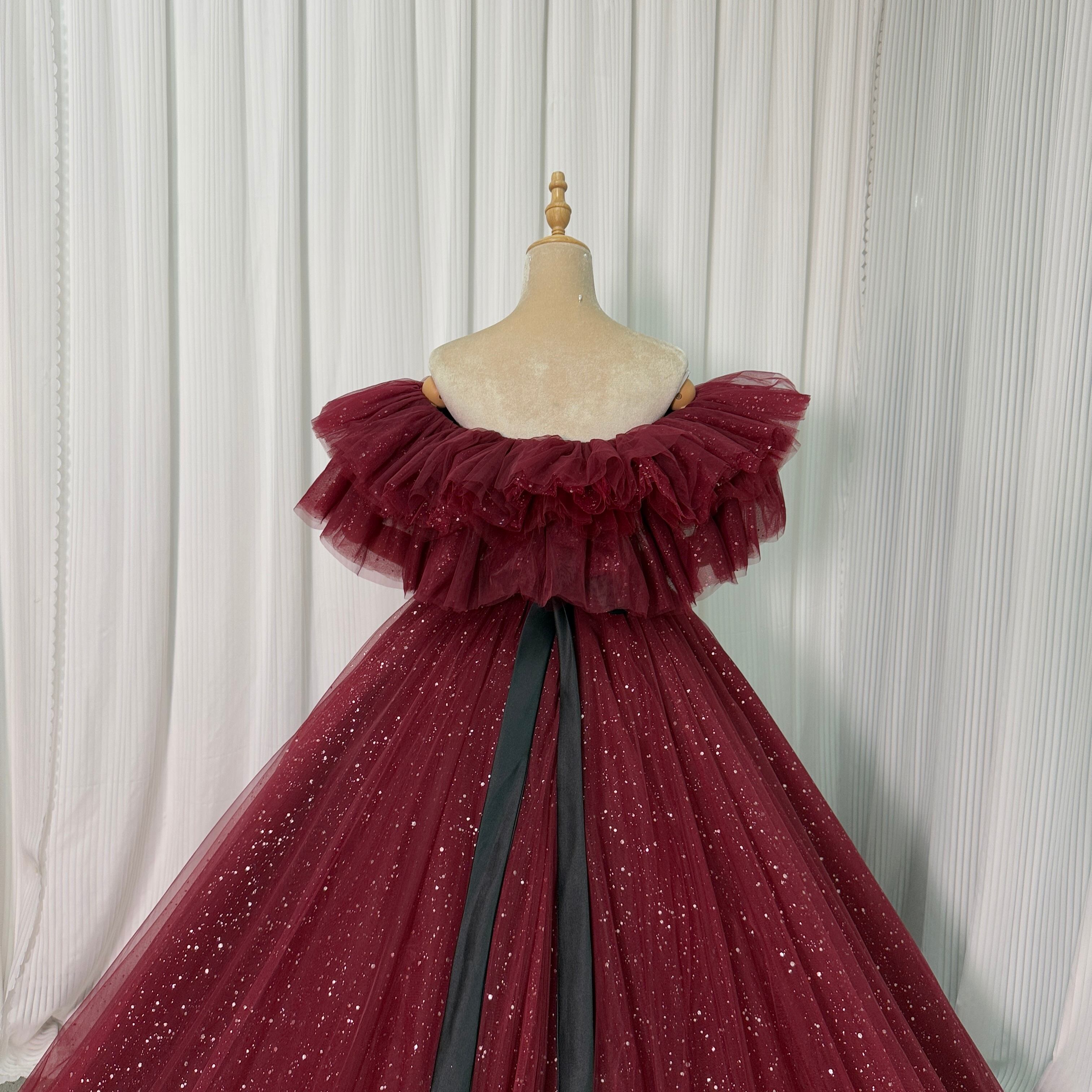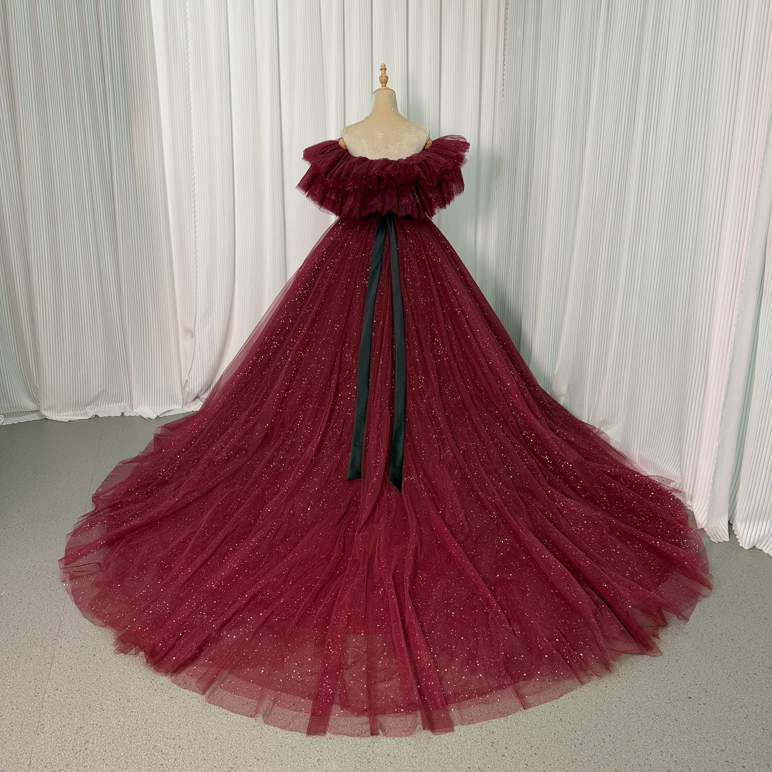 カラードレス ワインレッド オフショルダー キラキラグリッターチュール サッシュベルト ロングトレーン エレガント ブライダル