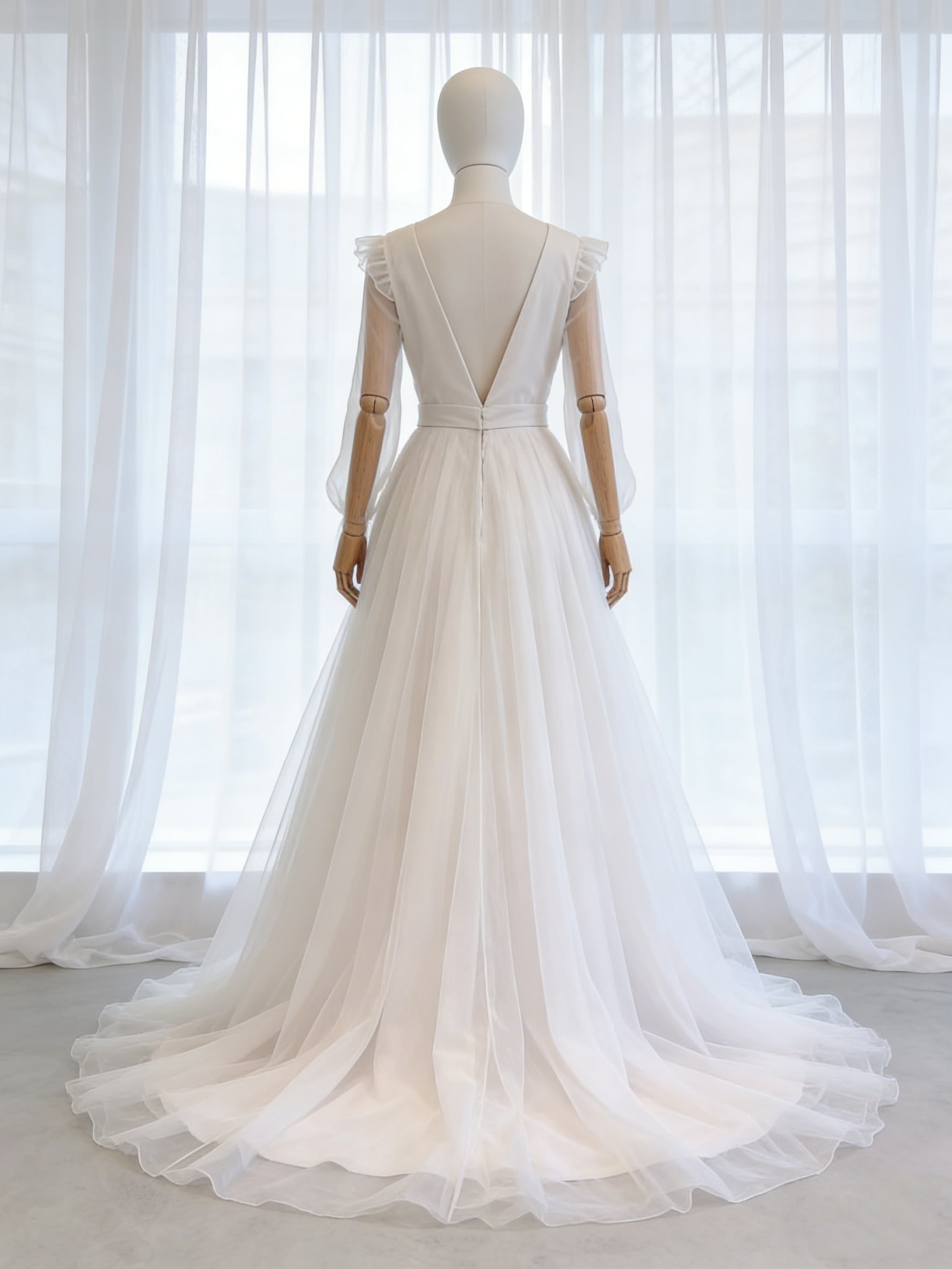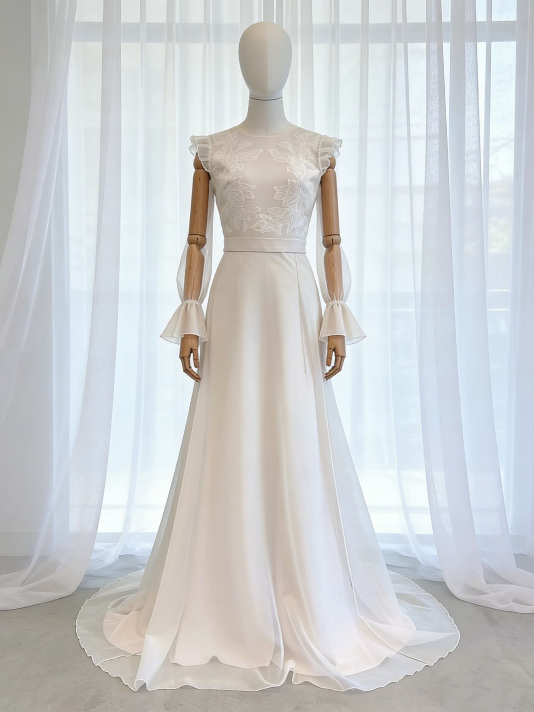 ウェディングドレス ロングスリーブ ラウンドネック Aライン リーフ刺繍 バックレス 結婚式/披露宴