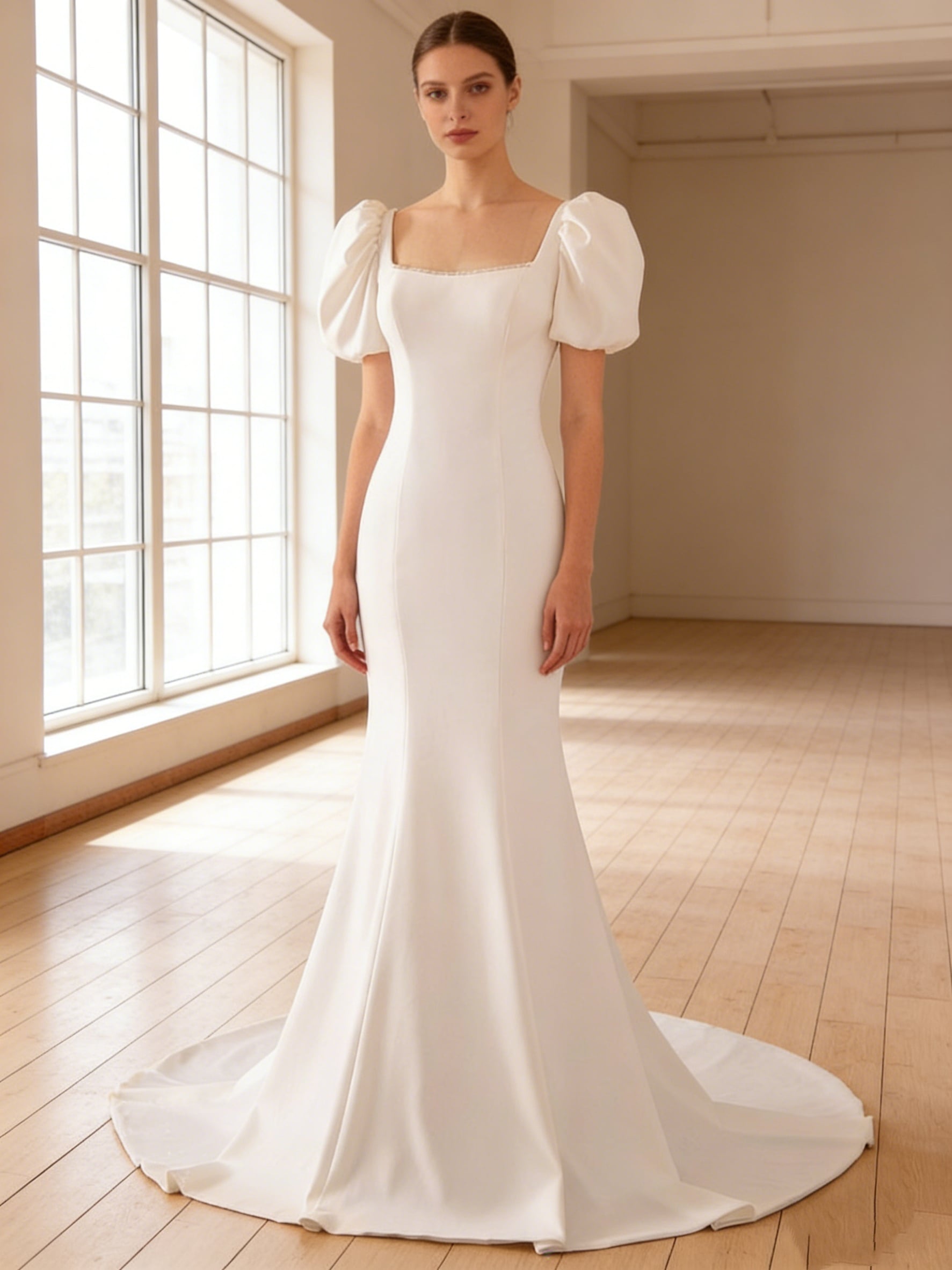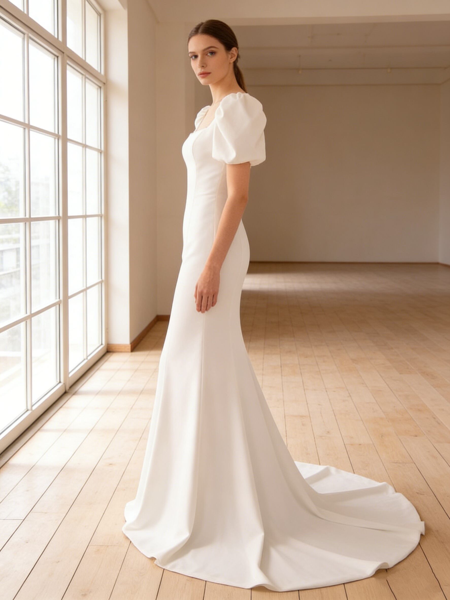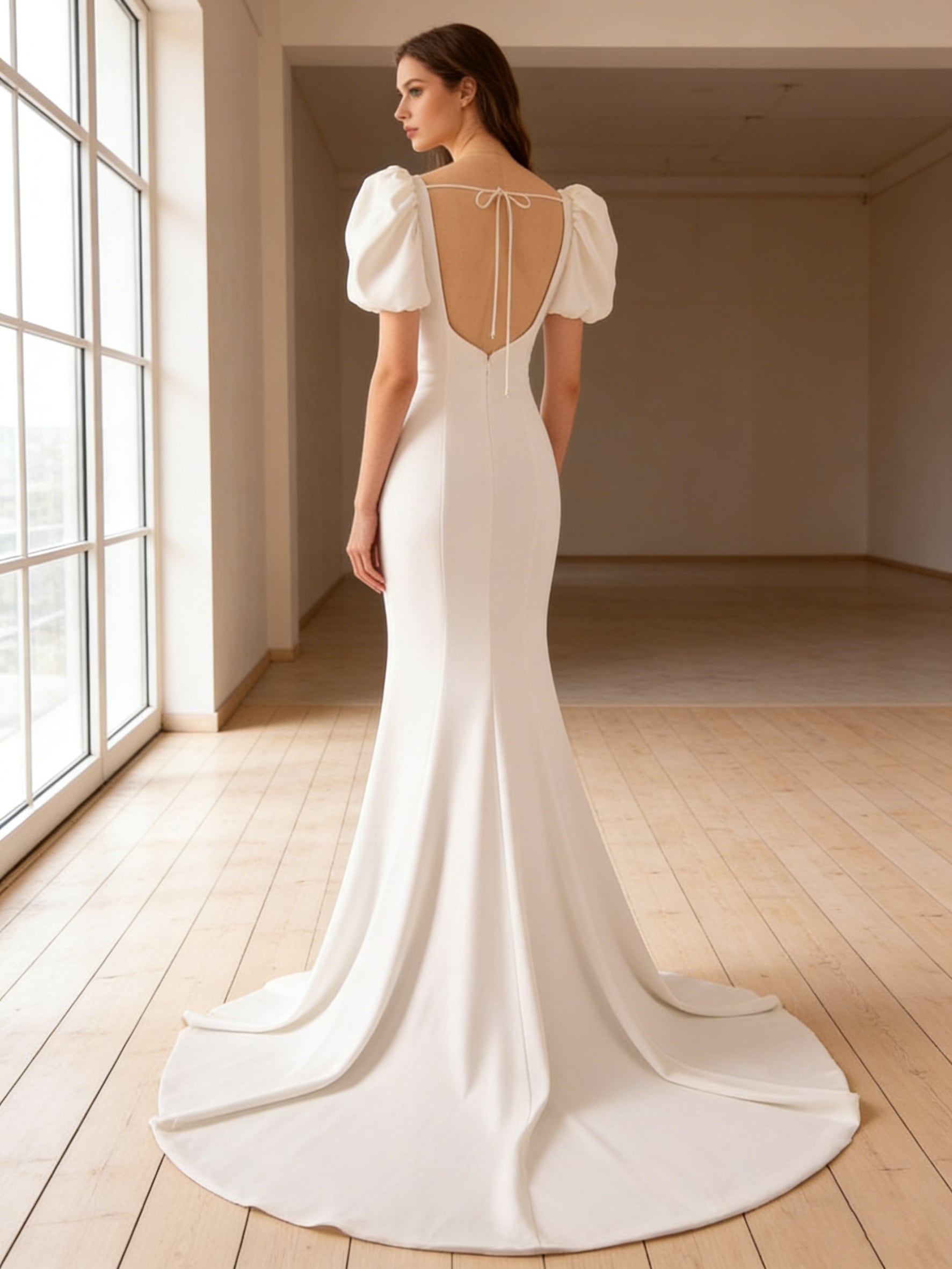パーティードレス パフスリーブ バックレス マーメイドライン クレープ生地 前撮り 二次会 ロングドレス