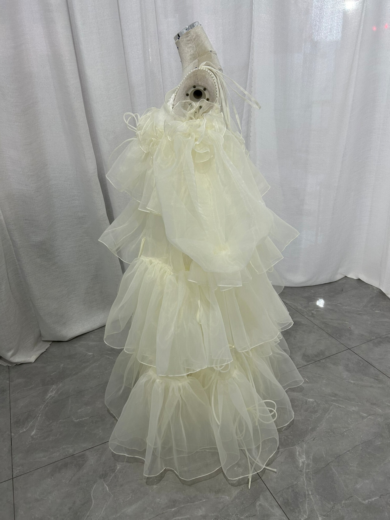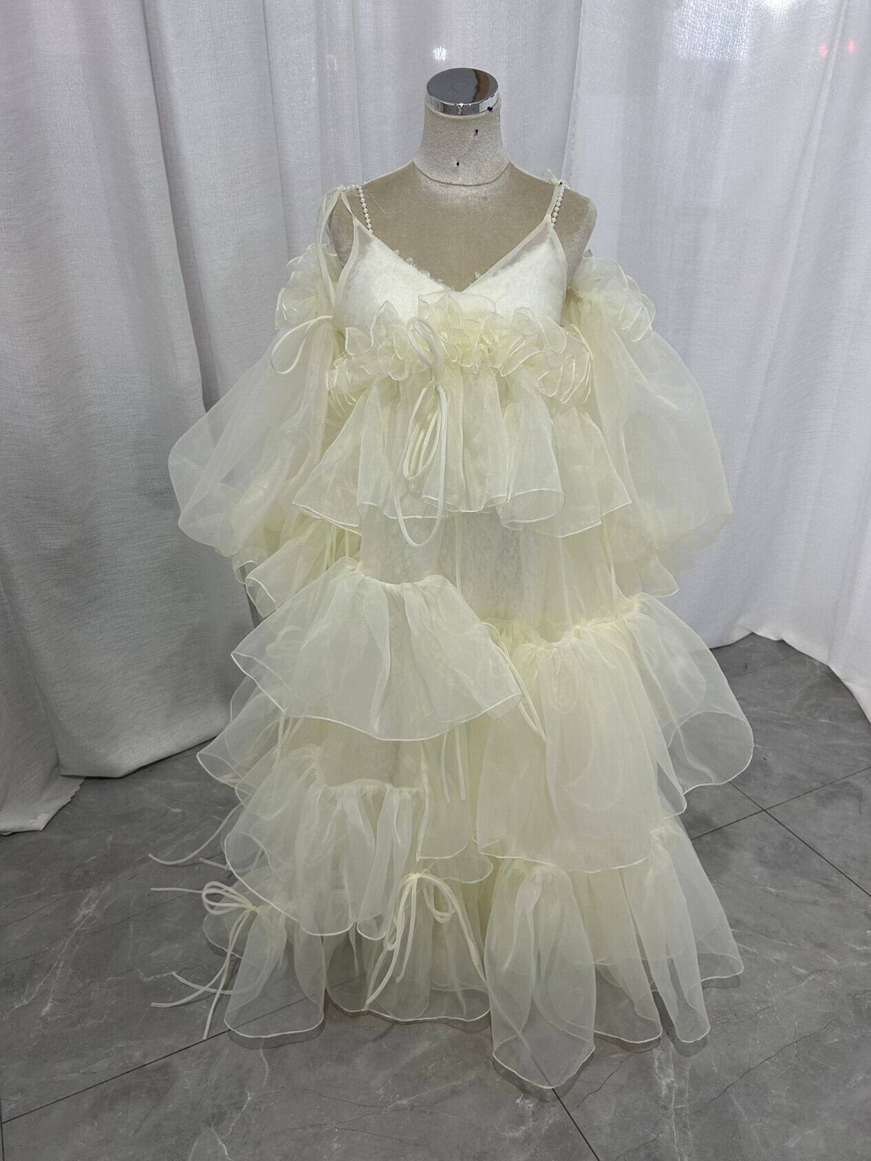パーティードレス アイボリー パフスリーブ ツーピース ロング アシンメトリードレス リボン 前撮り