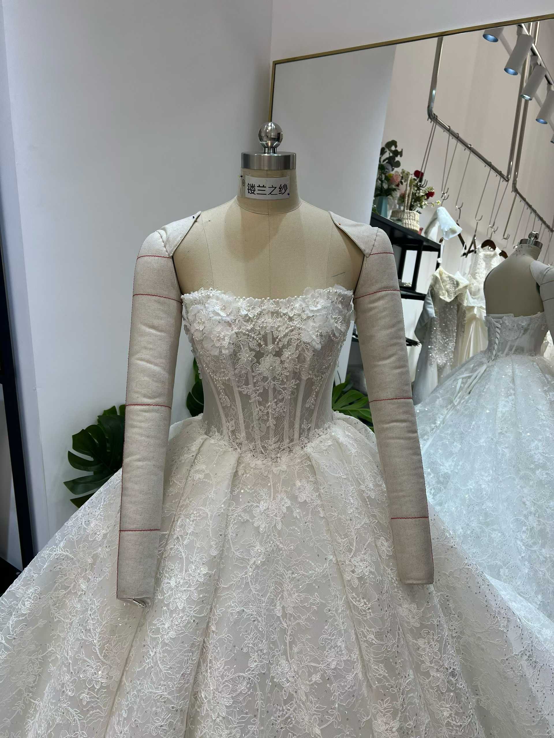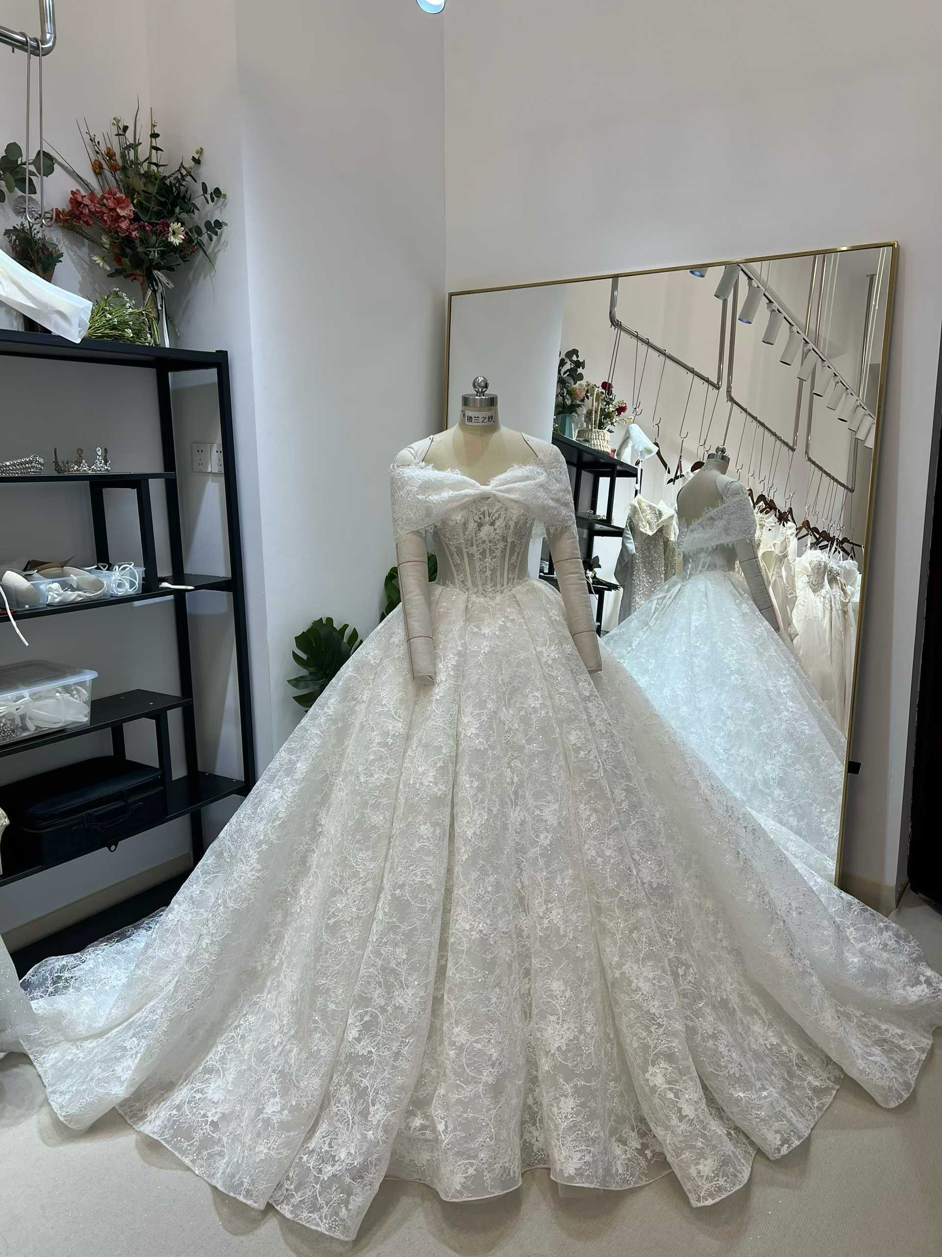 ウェディングドレス オフショルダー 3D立体レース刺繍 贅沢な小花柄の総レース フレアスカート 結婚式/披露宴