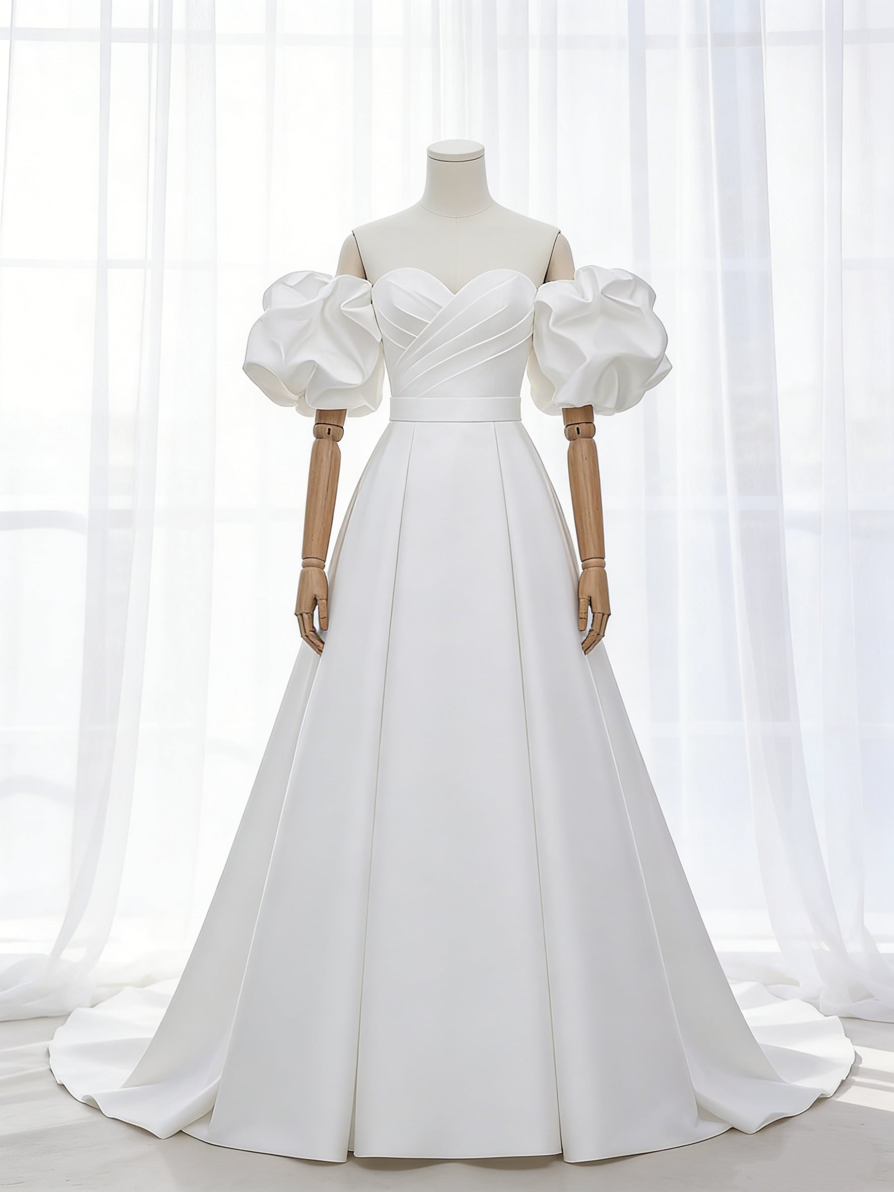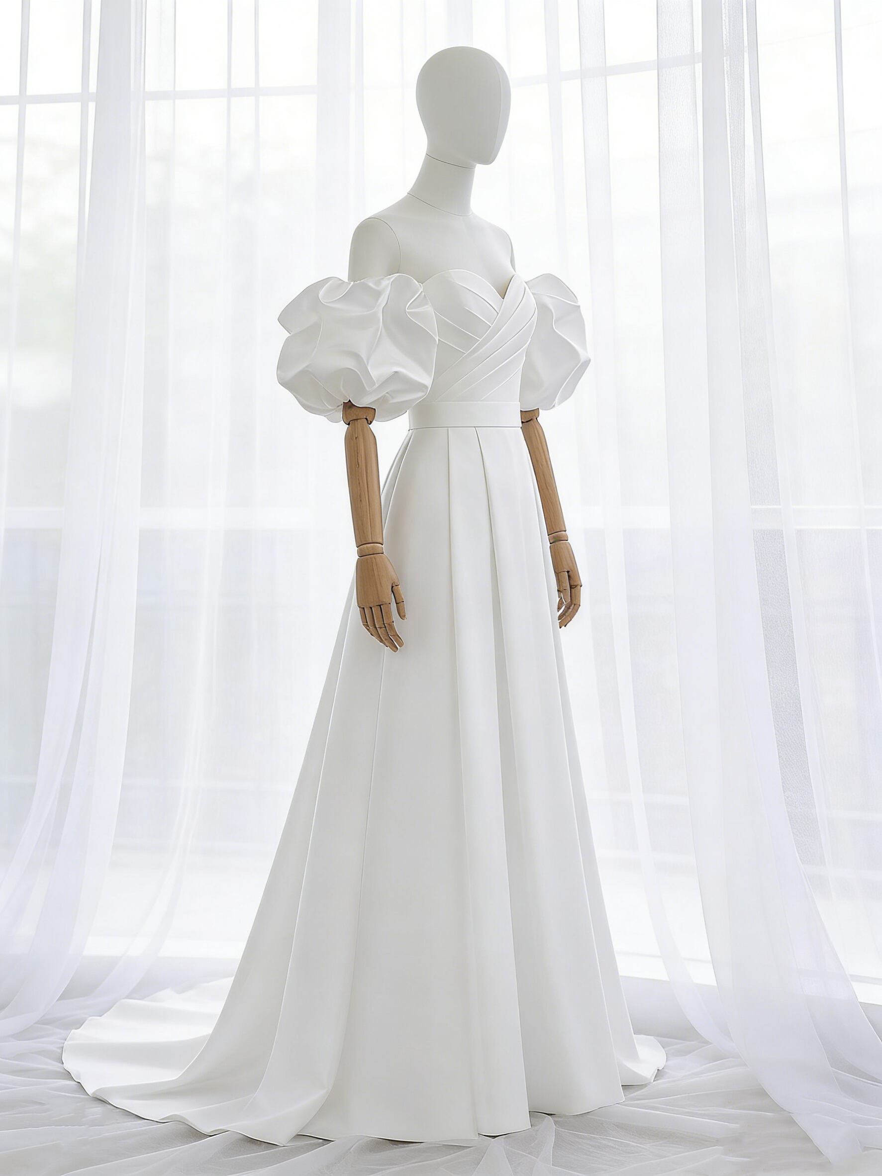 ウェディングドレス パフスリーブ ハンドドレープ Aライン スレンダーライン 結婚式
