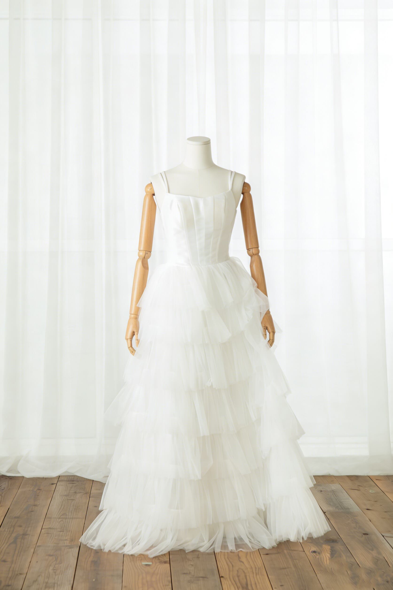 ウェディングドレス キャミソール 床付く 前撮り 二次会 チュールドレス ティアードのドレス