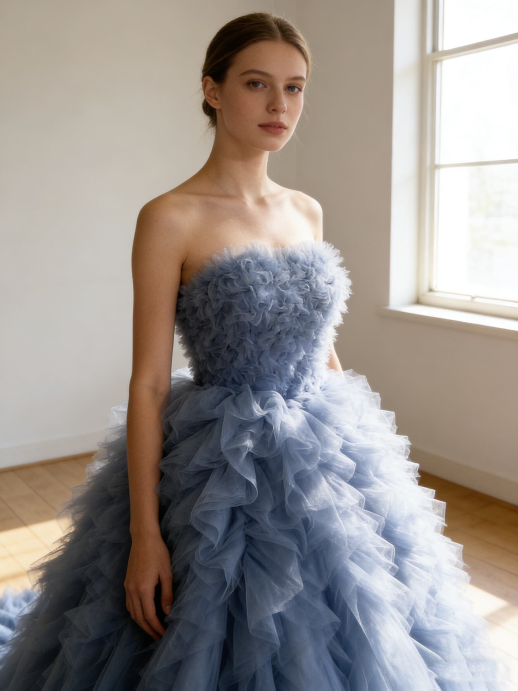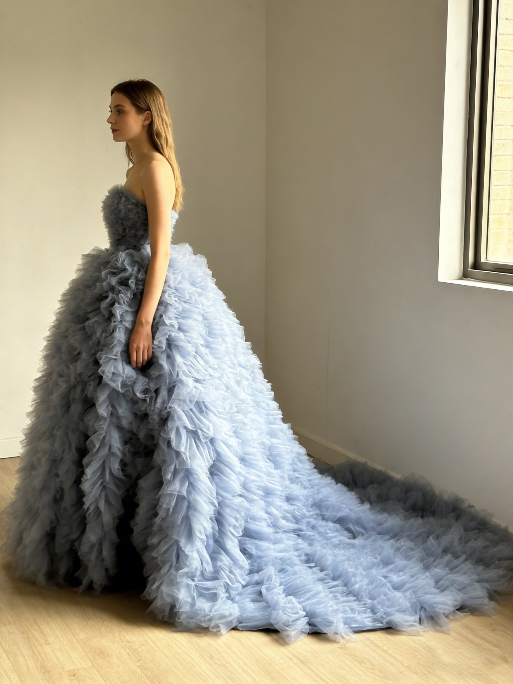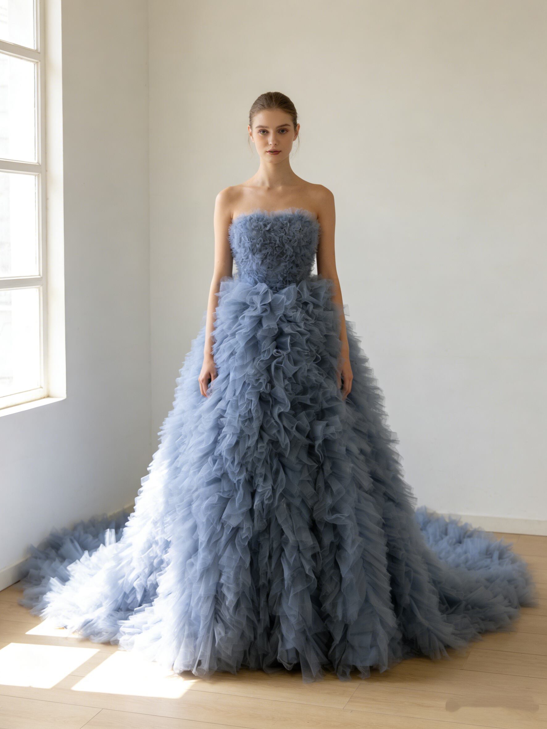 カラードレス ブルーグレー ベアトップ もこもこドレス ラッフルフリル 編み上げ 抜群のおしゃれ見え