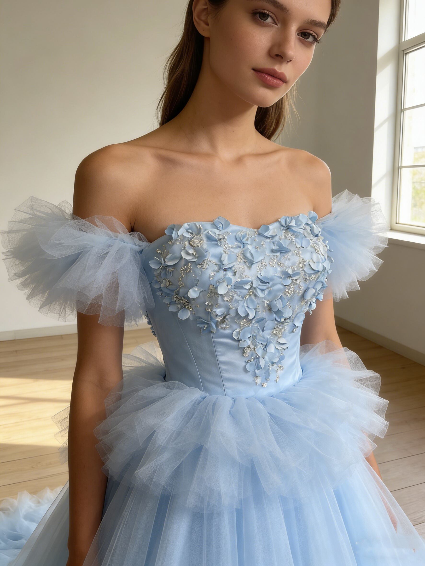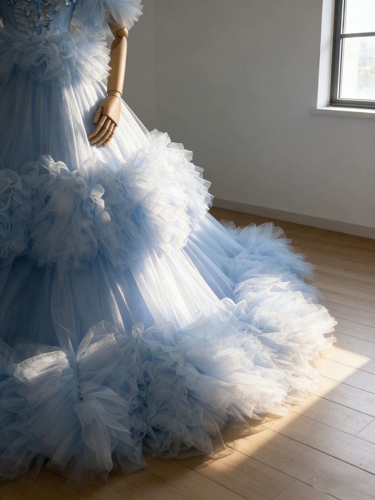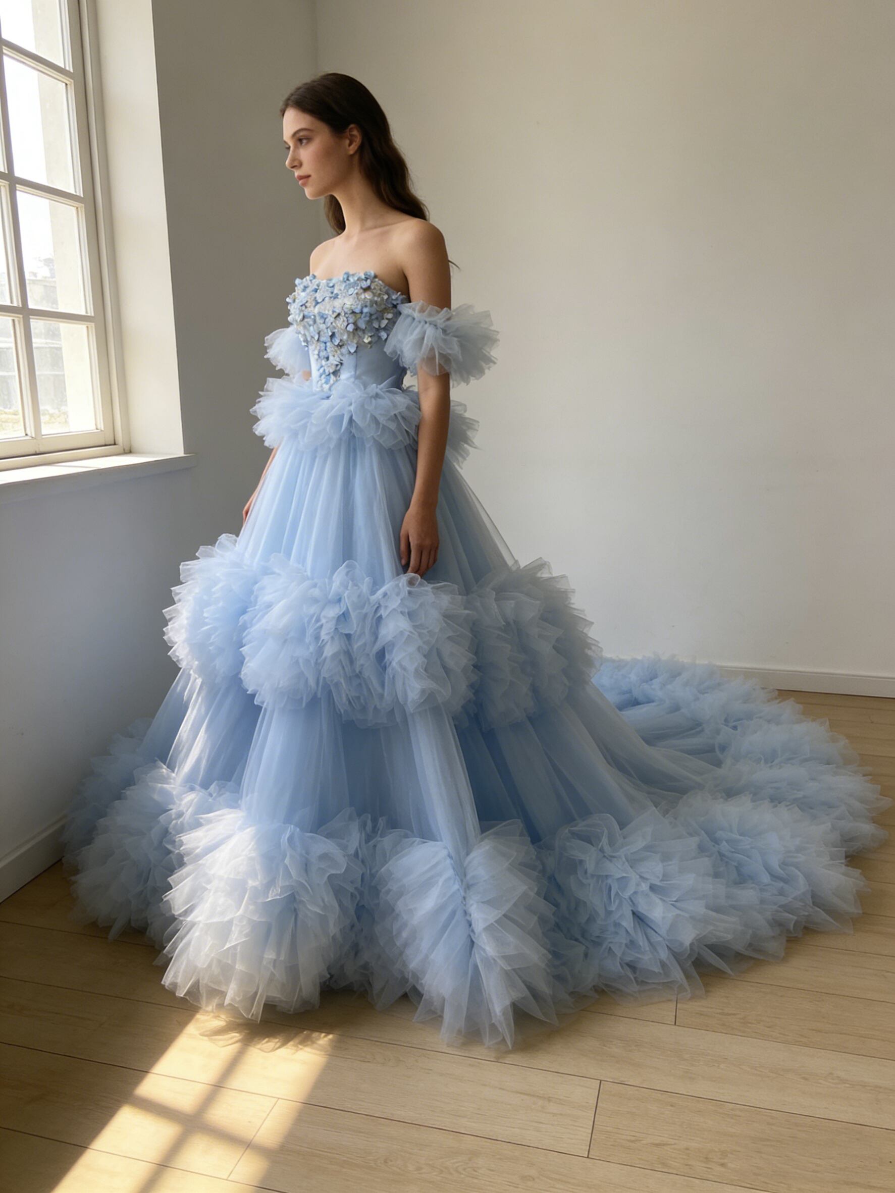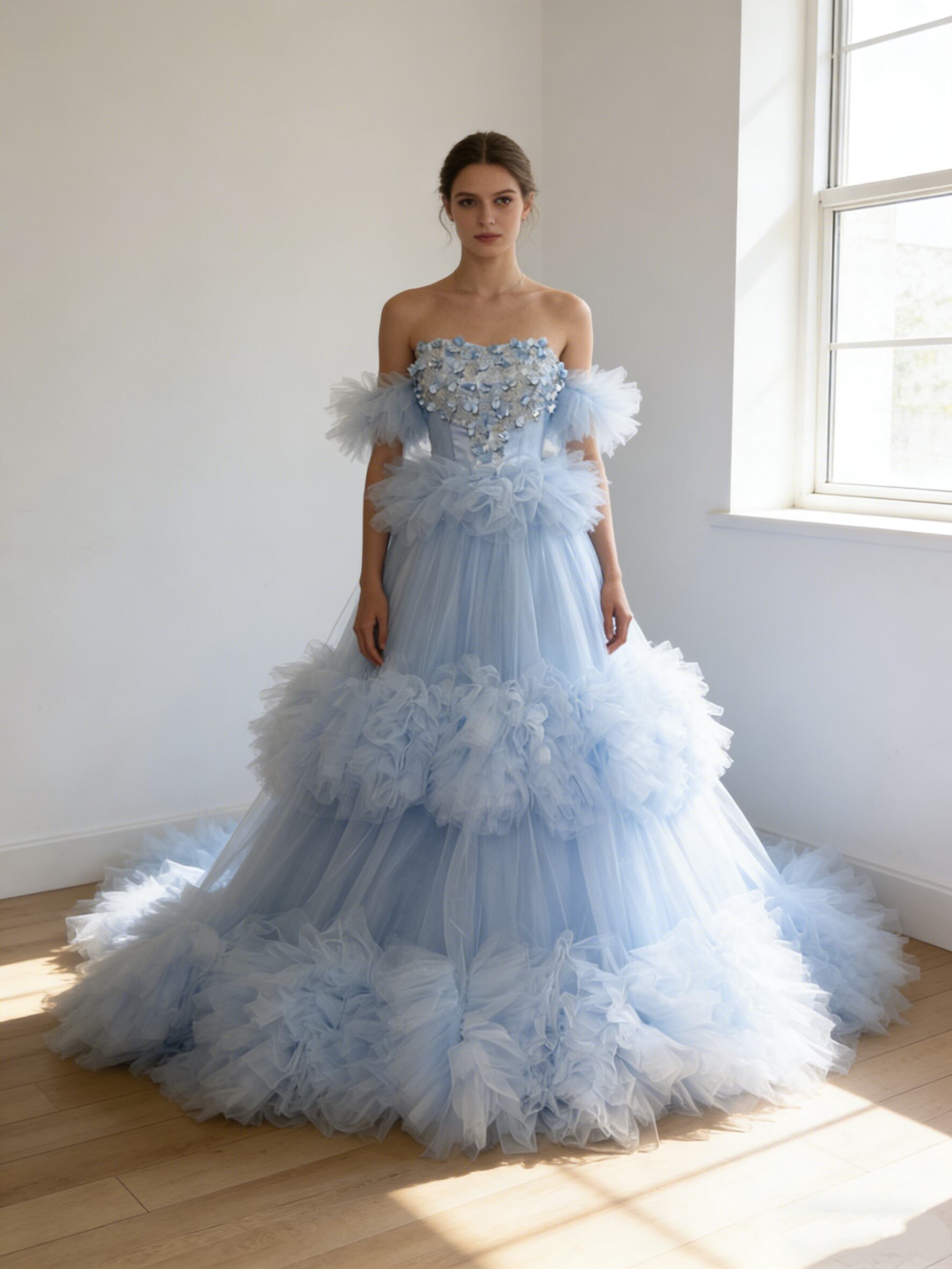 カラードレス 爽やかで優しいブルー フリル袖 もこもこドレス ボリュームドレス プリンセスライン