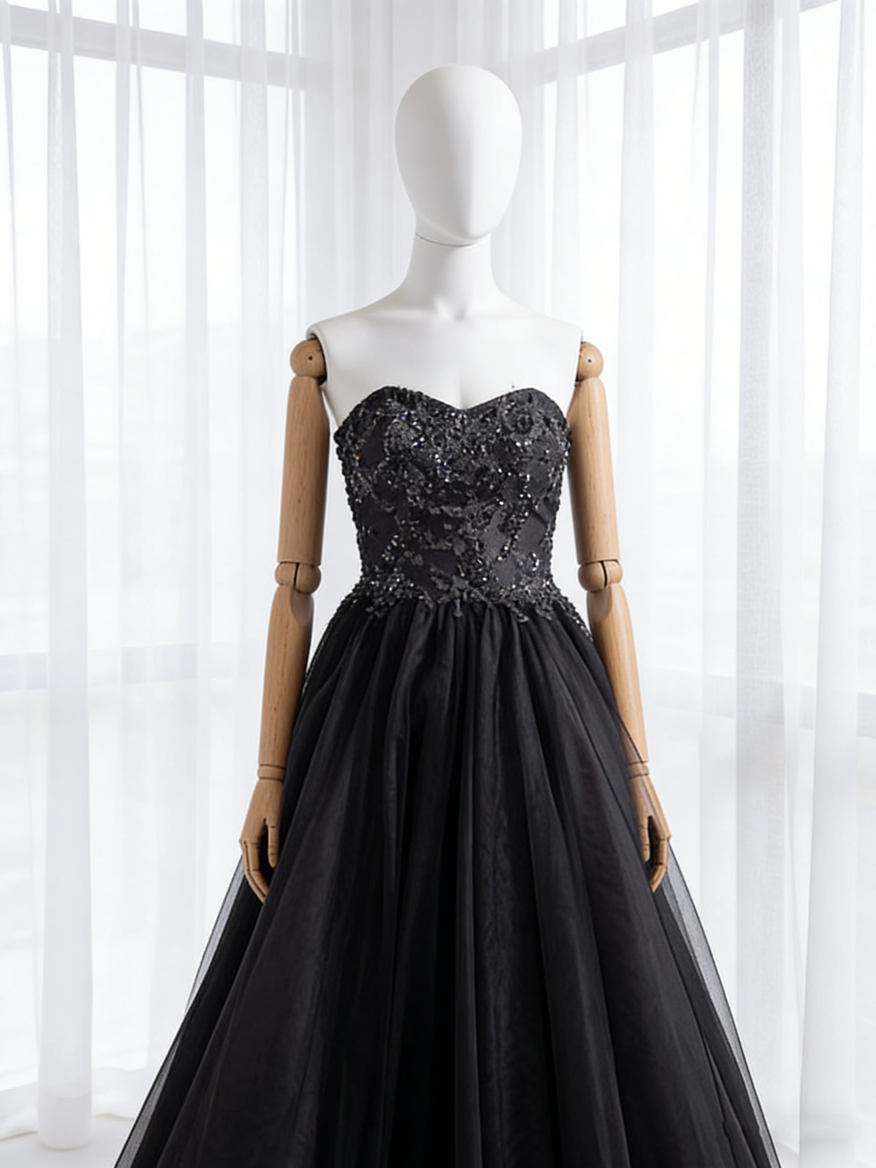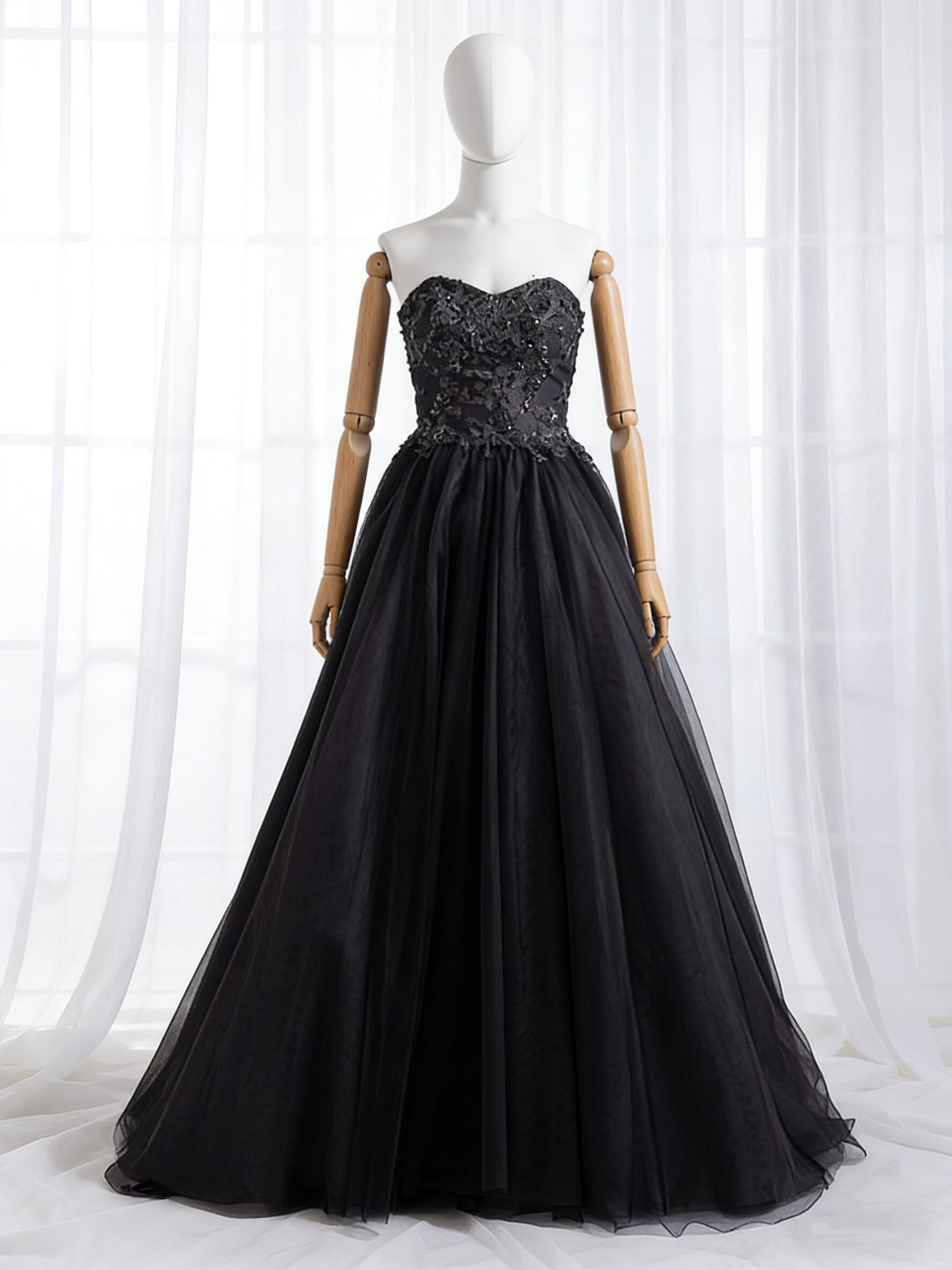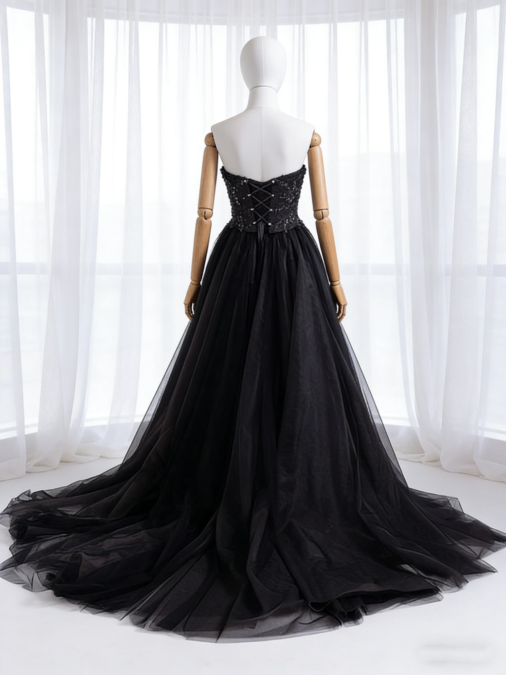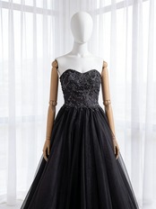 カラードレス ブラック ベアトップ チュールスカート 3D立体レース刺繍 前撮り 二次会 音楽会