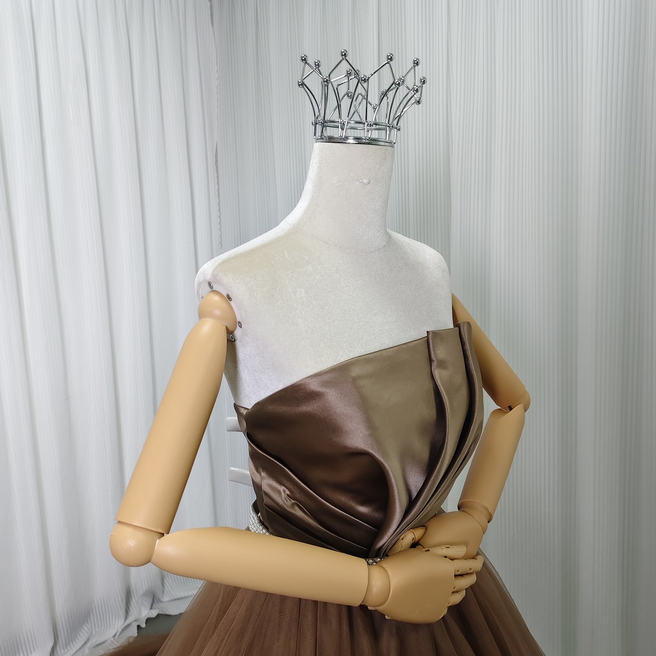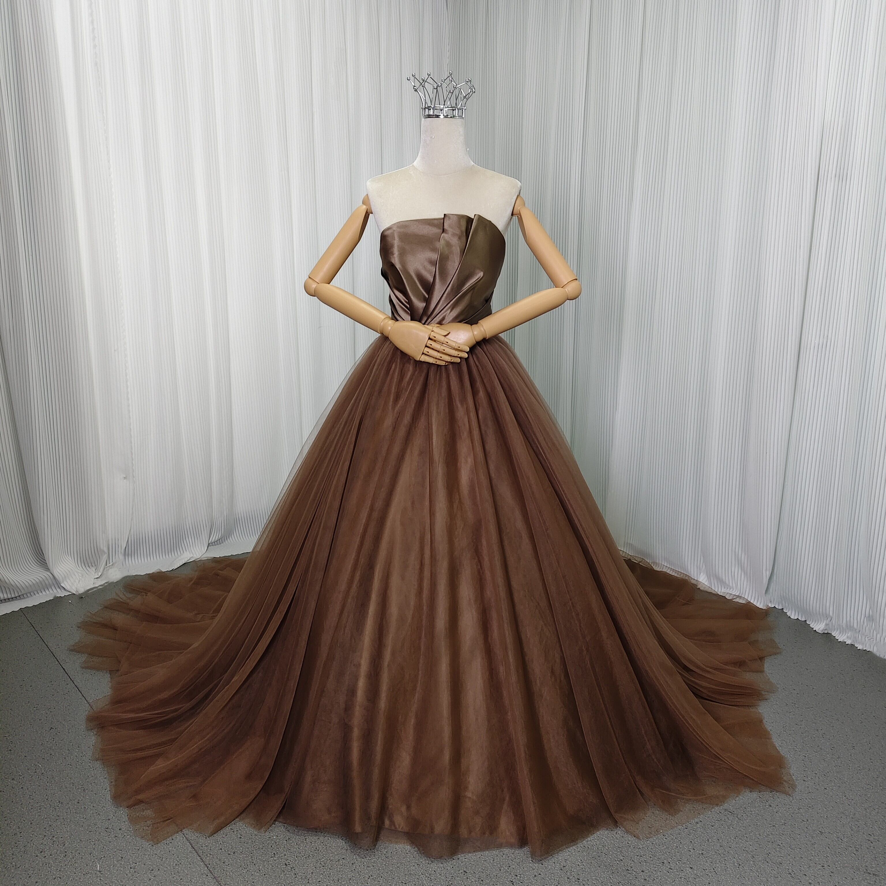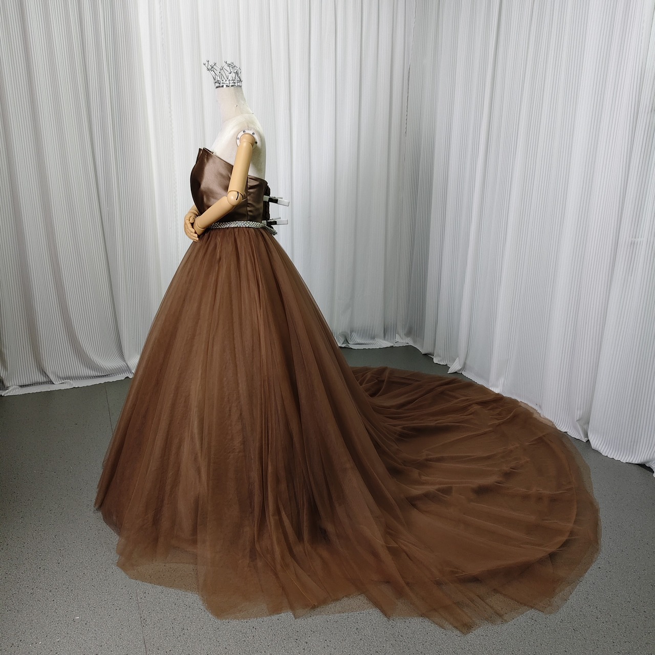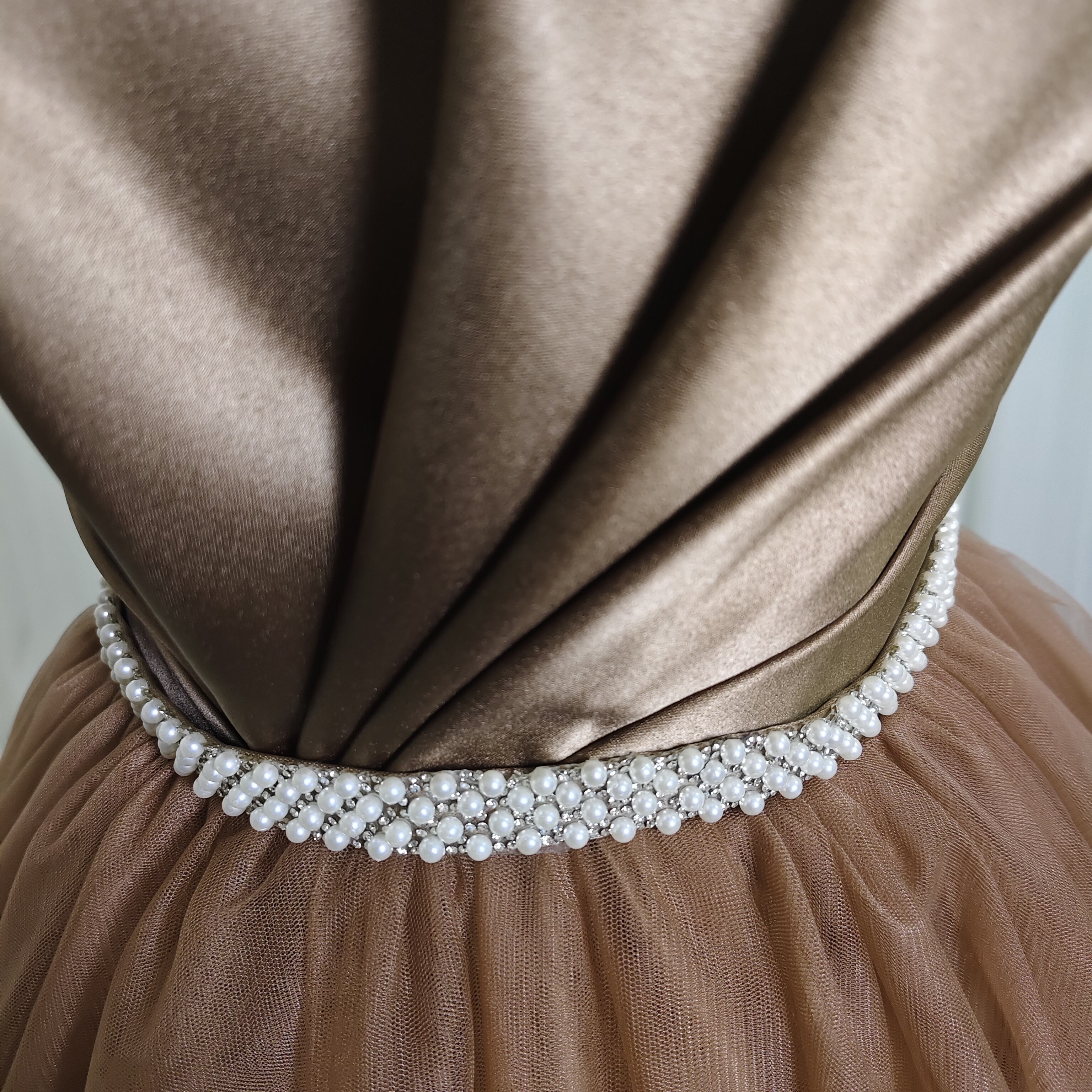 カラードレス ベアトップ コーヒー色 ビーズ チュールスカート エレガント アンティークなドレス 結婚式