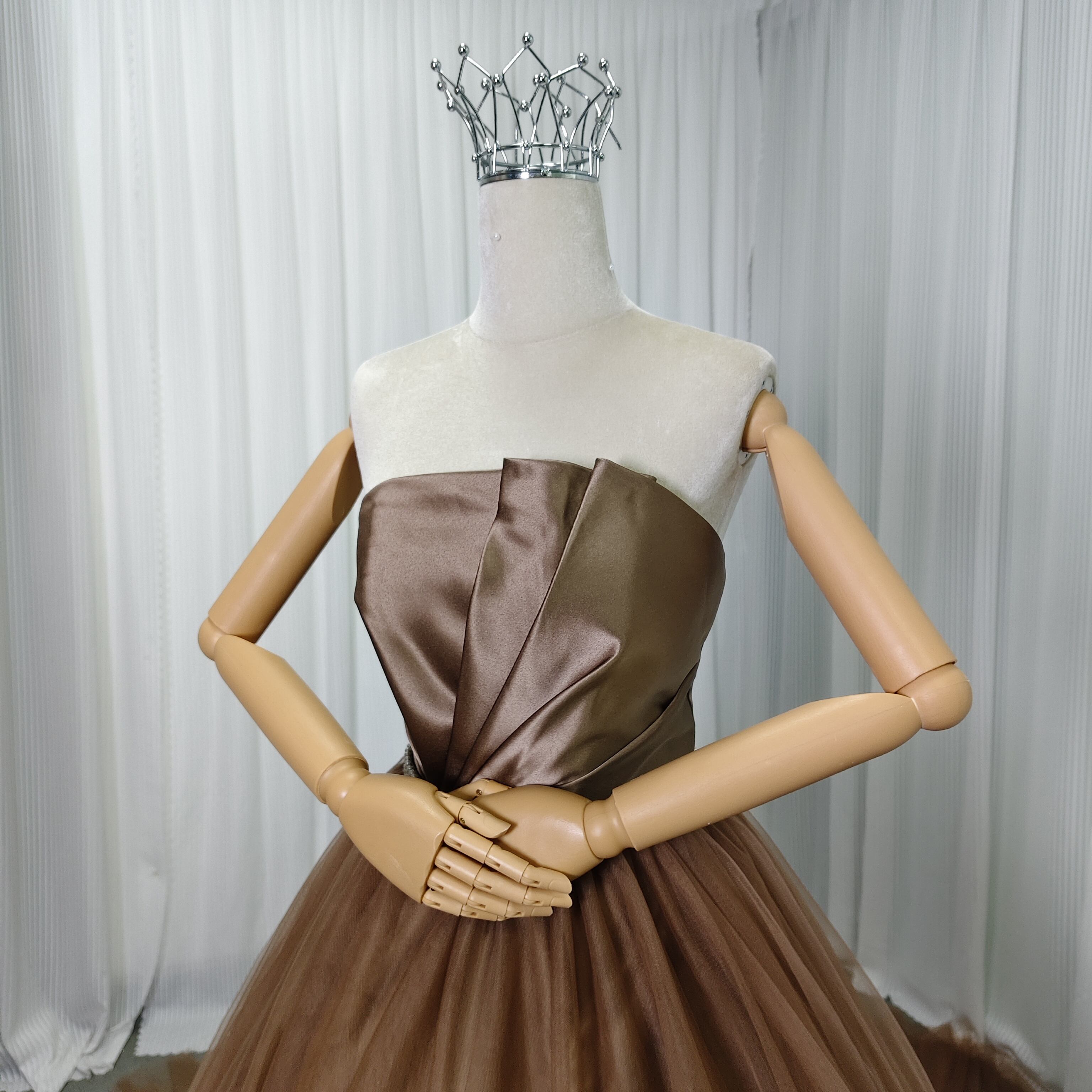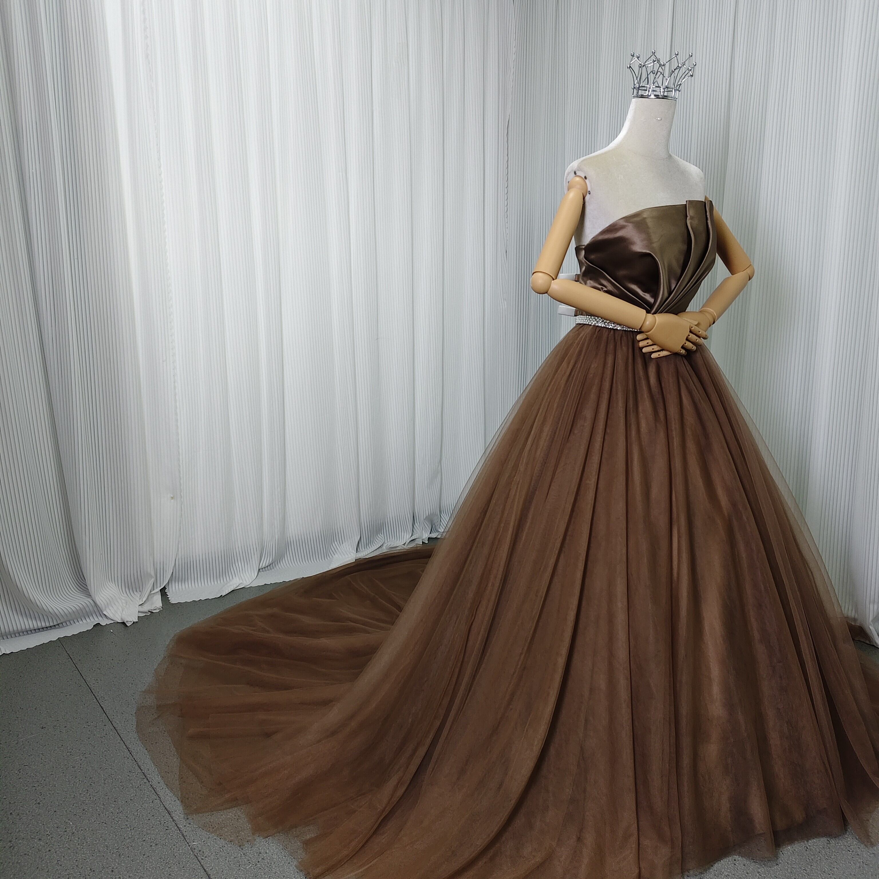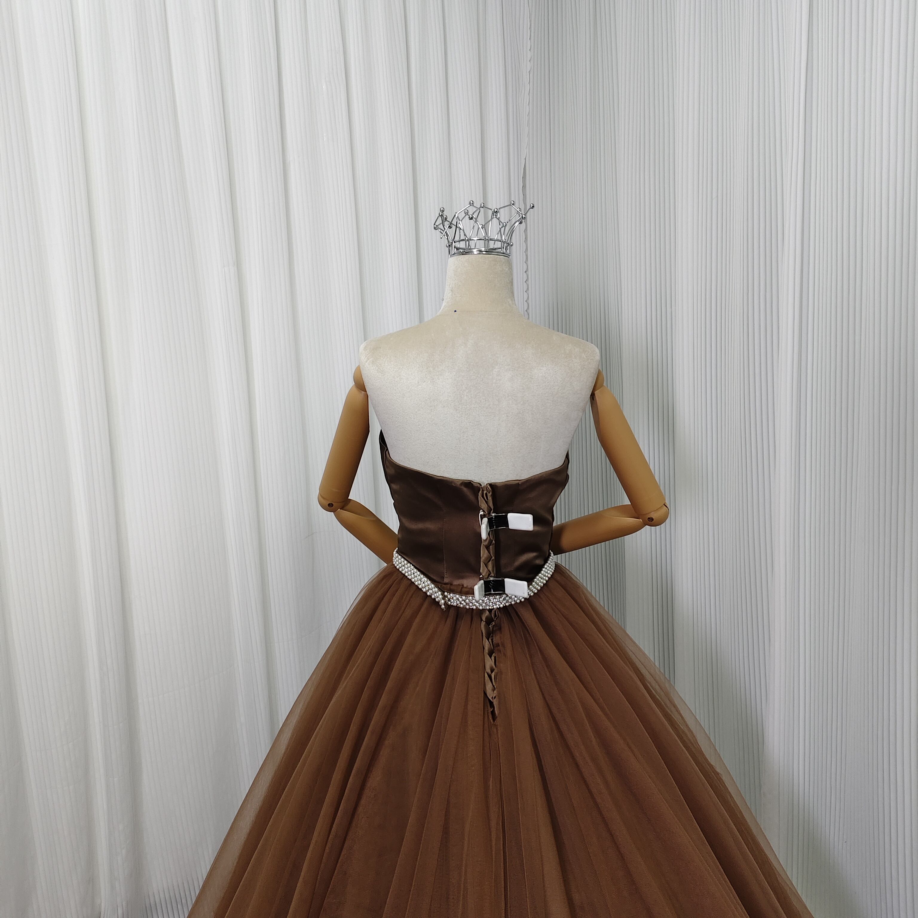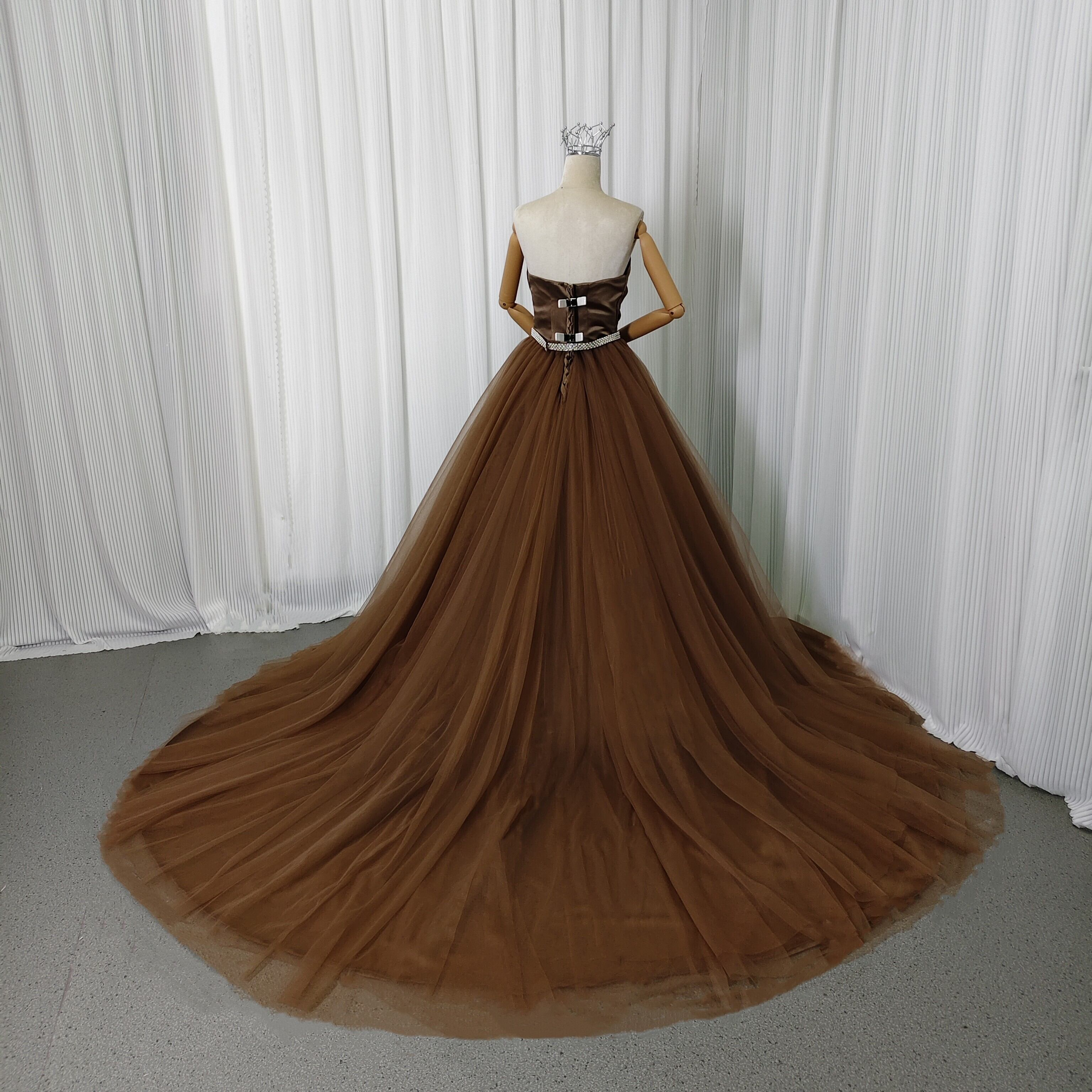 カラードレス ベアトップ コーヒー色 ビーズ チュールスカート エレガント アンティークなドレス 結婚式