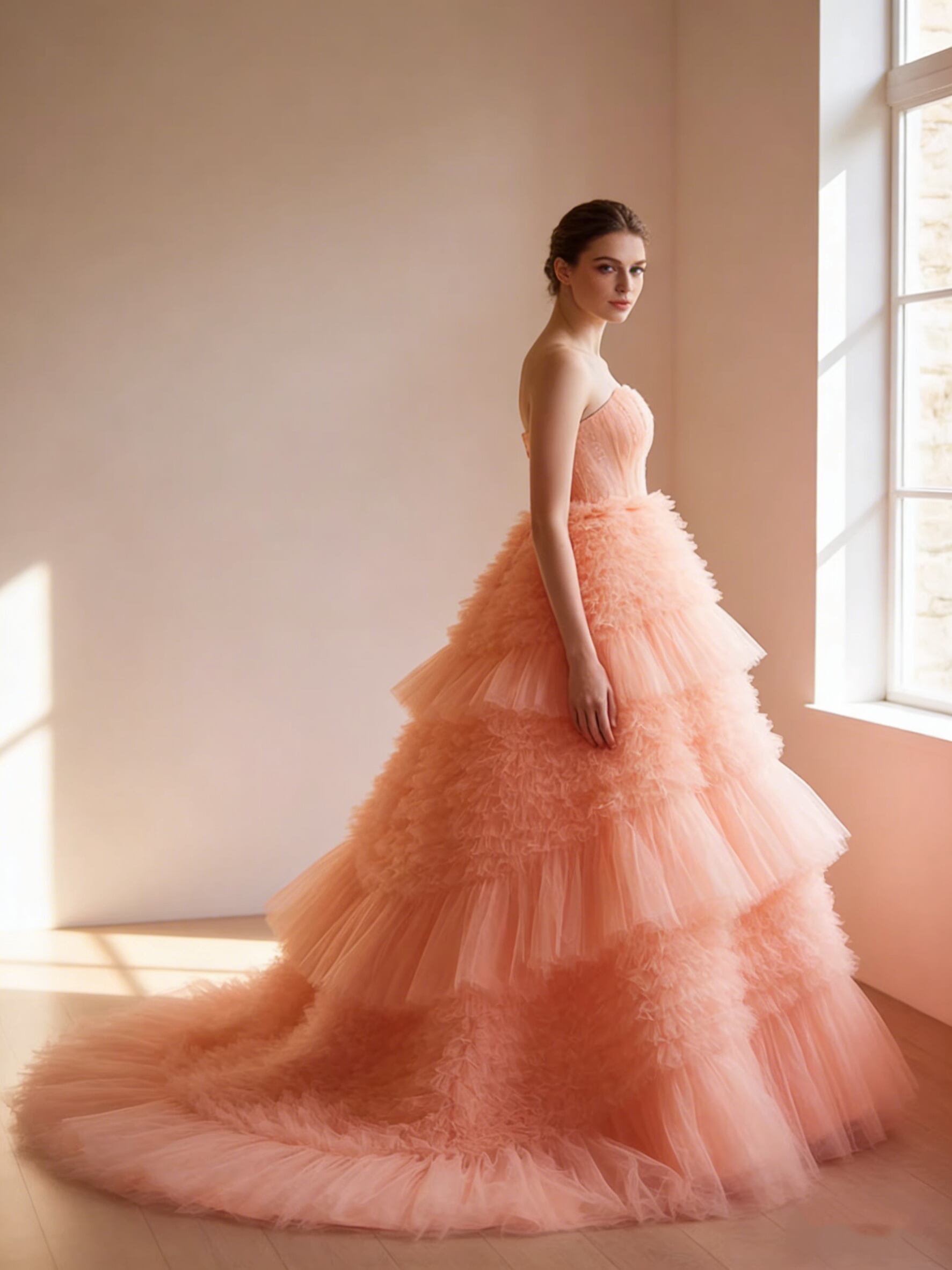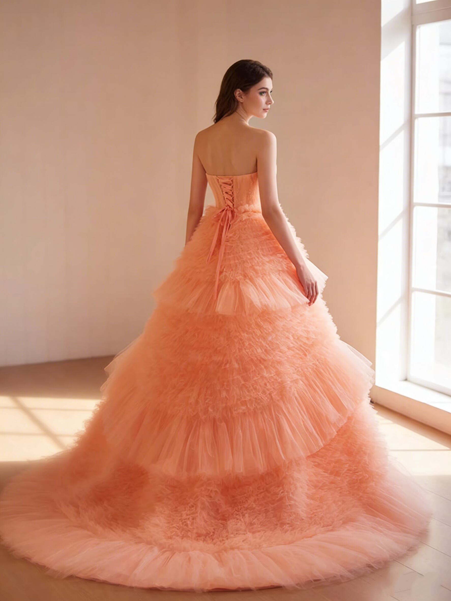 カラードレス オレンジ ベアトップ もこもこドレス 編み上げ 柔らかく重ねたチュールスカート ブライダル