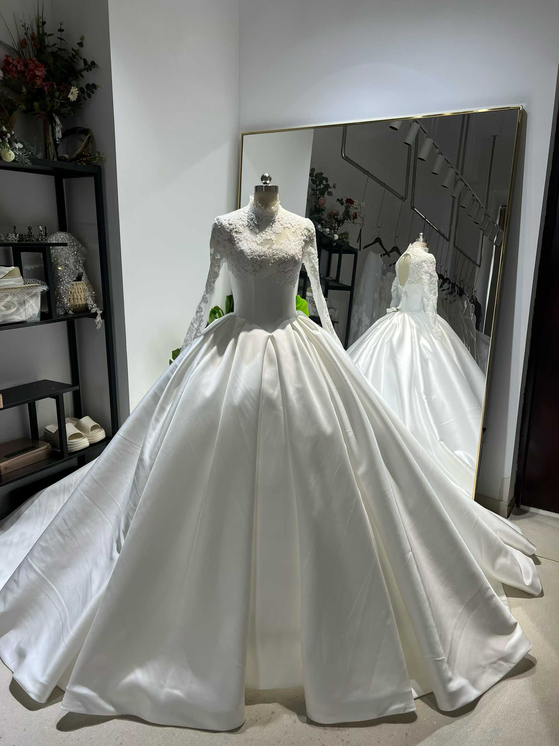 ウェディングドレス ロングスリーブ ミカドサテン 韓国風ドレス ブライダル 前撮り 結婚式 ボリュームドレス