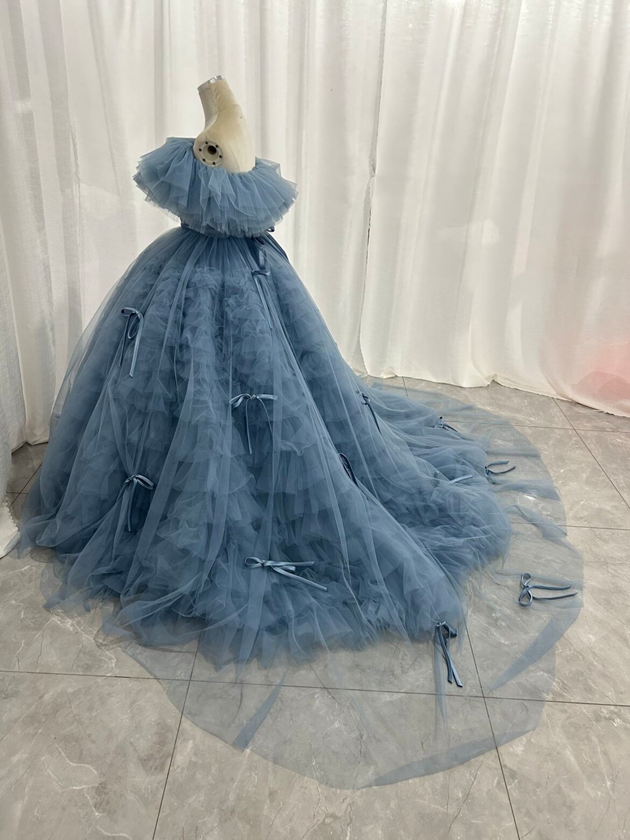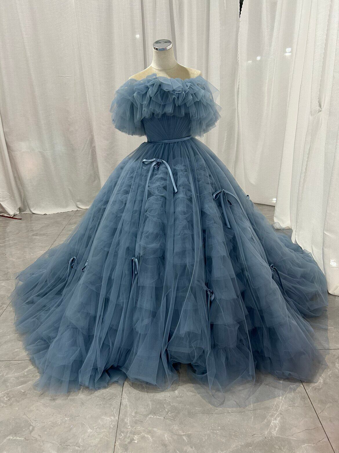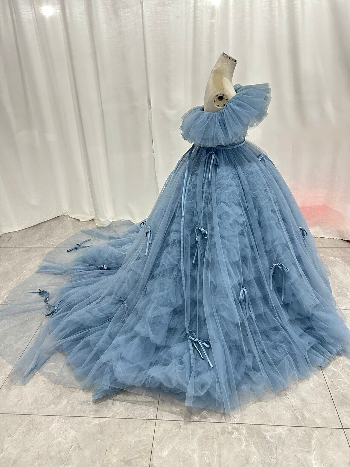 カラードレス オフショルダー もこもこドレス 2ways リボン 前撮り ブライダル ブルーグレー 花嫁