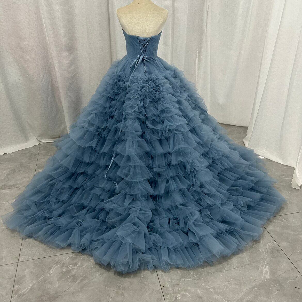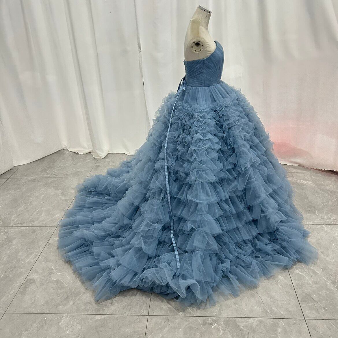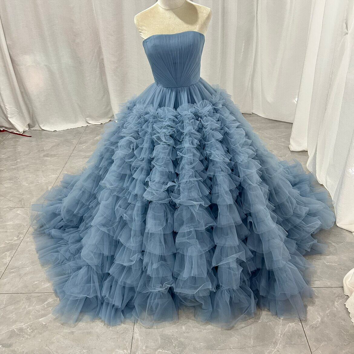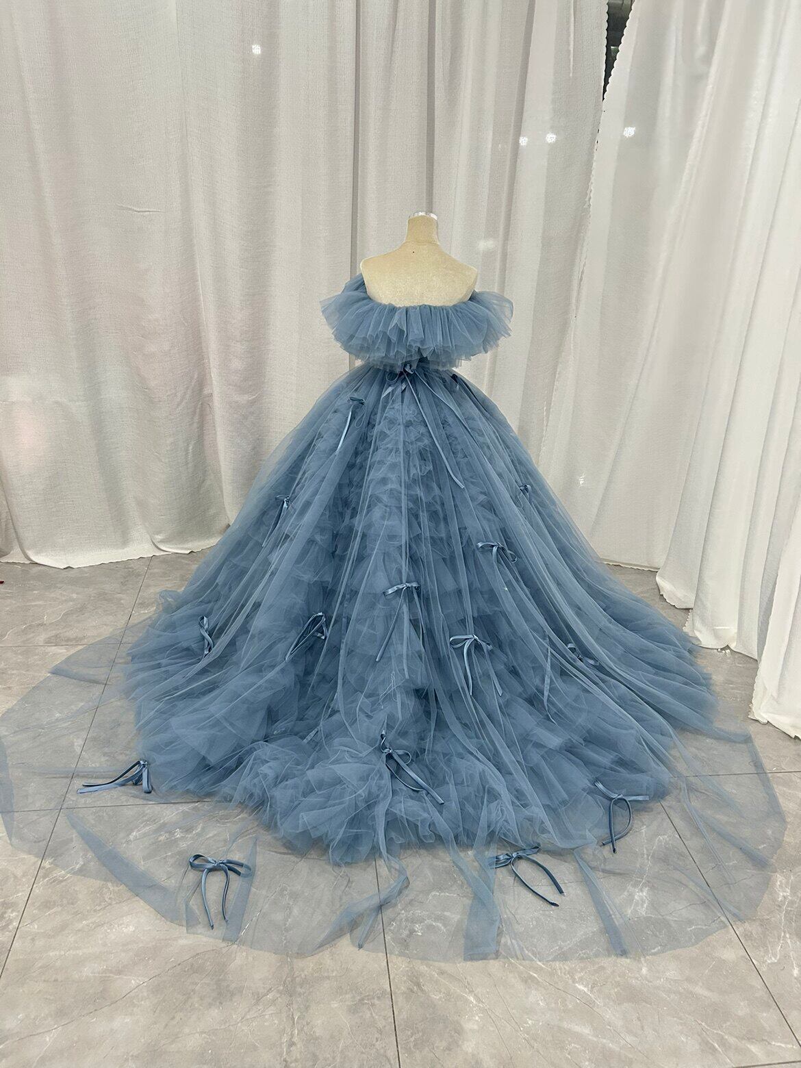 カラードレス オフショルダー もこもこドレス 2ways リボン 前撮り ブライダル ブルーグレー 花嫁