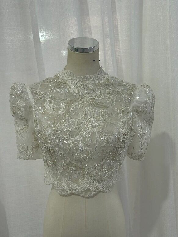実例写真!ボレロのみ 半袖 ハイネック キラキラ光る刺繍 韓国風ドレス 華やか 披露宴/結婚式 素敵な