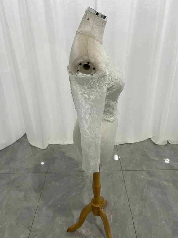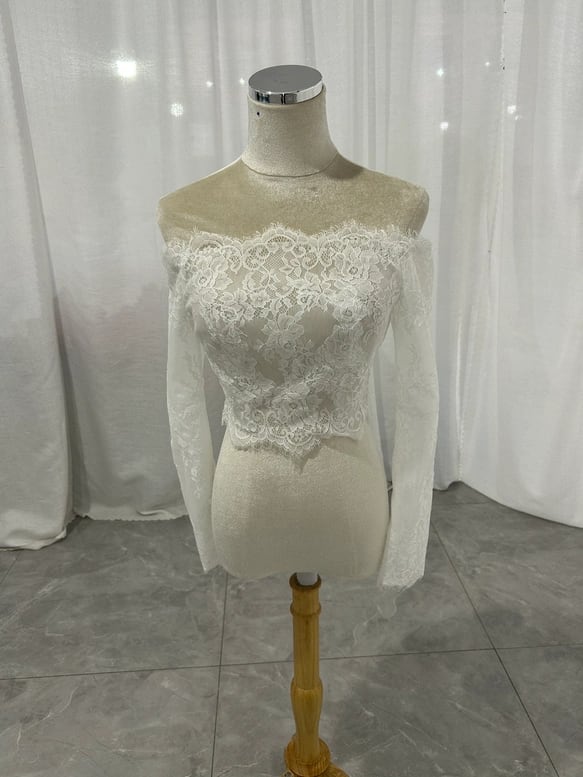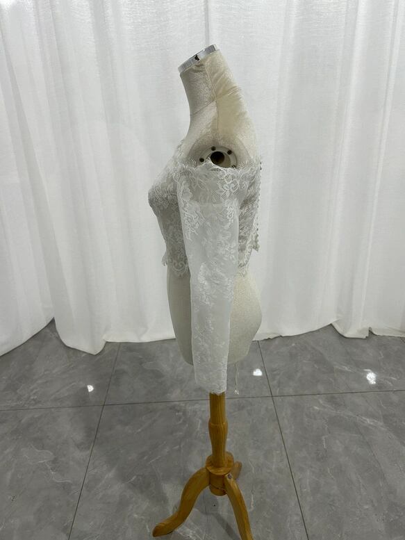 ボレロ オフホワイト オフショルダー 美しい花レース ロングスリーブ ハンドメイド くるみボタン 結婚式
