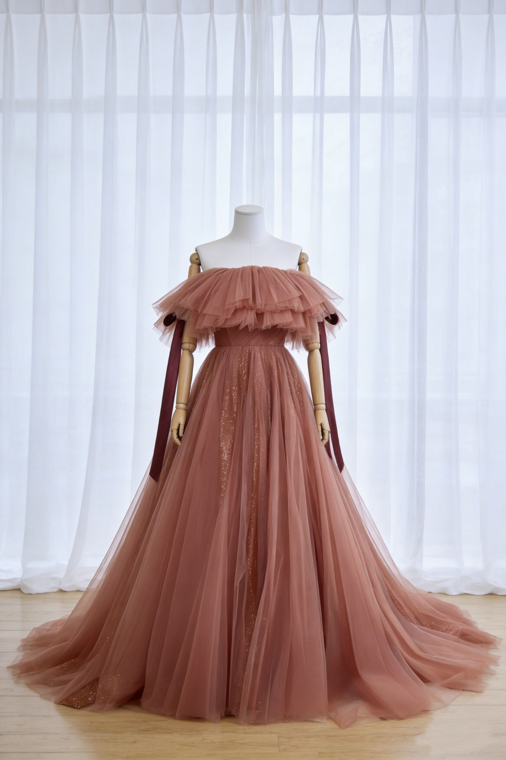 カラードレス オフショルダー キラキラグリッターチュール 編み上げ Aライン スレンダーライン