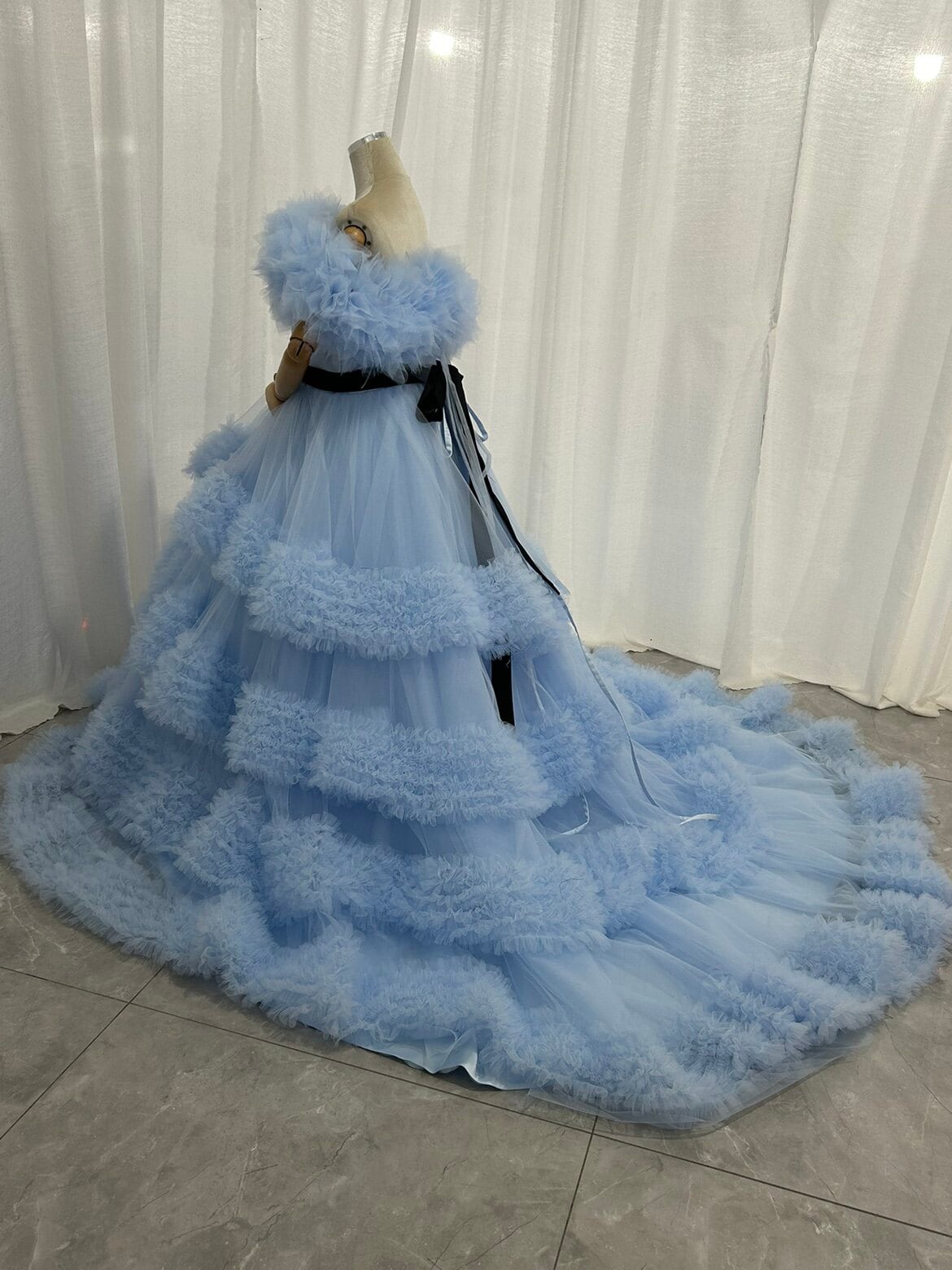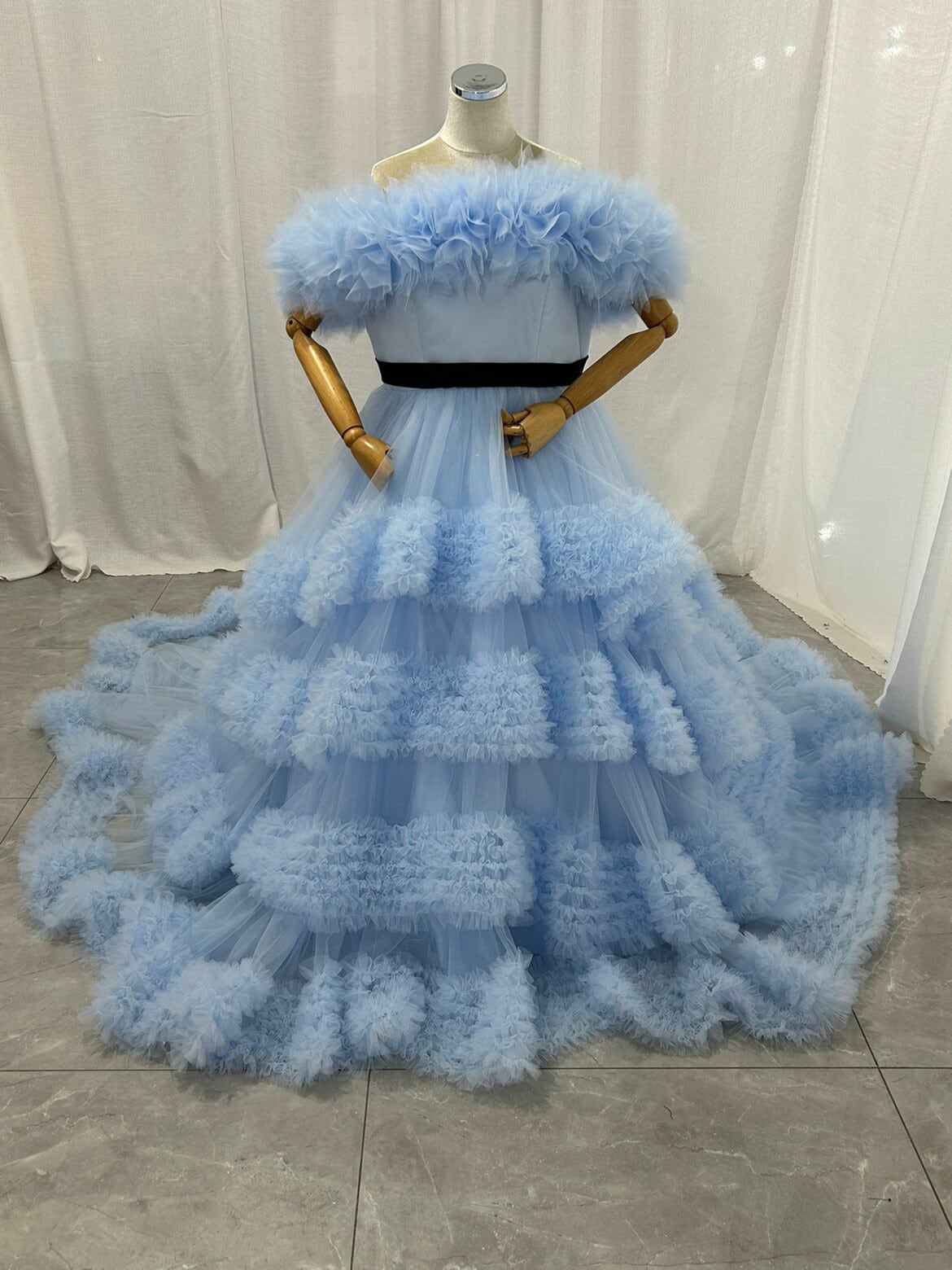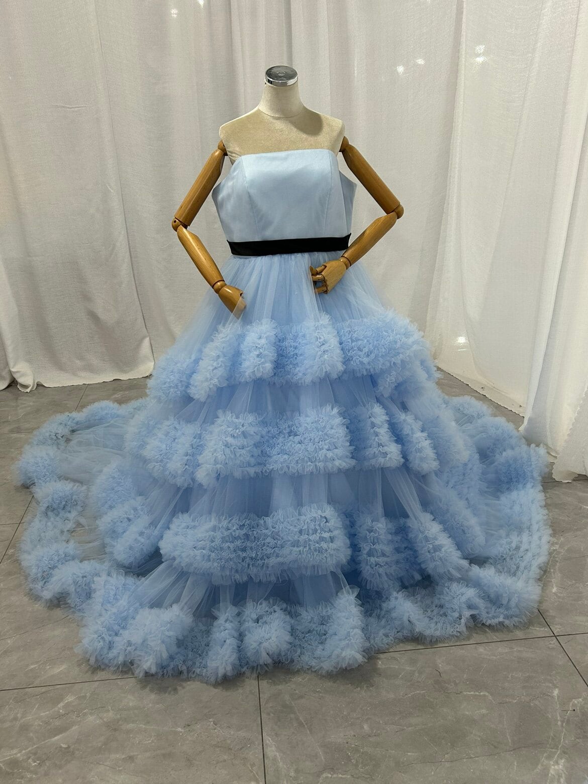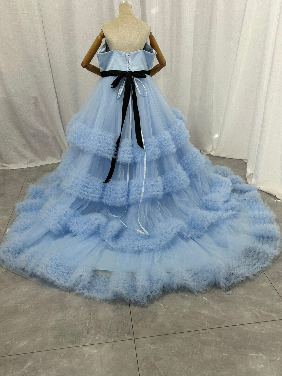 カラードレス ブルー 取り外し可能なオフショルダー ラッフルフリル 編み上げ プリンセスライン 前撮り ブライダル