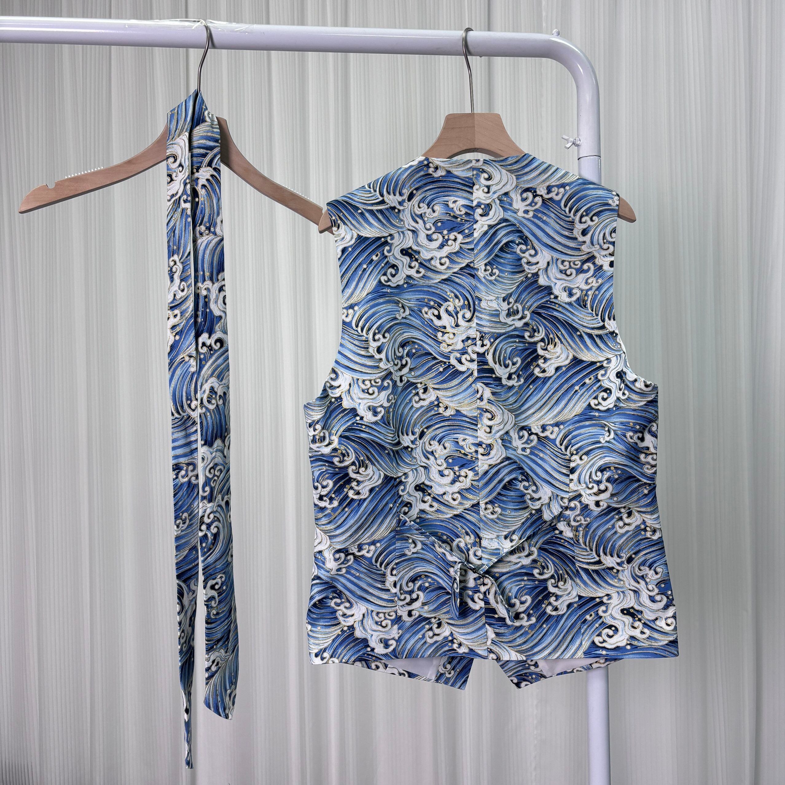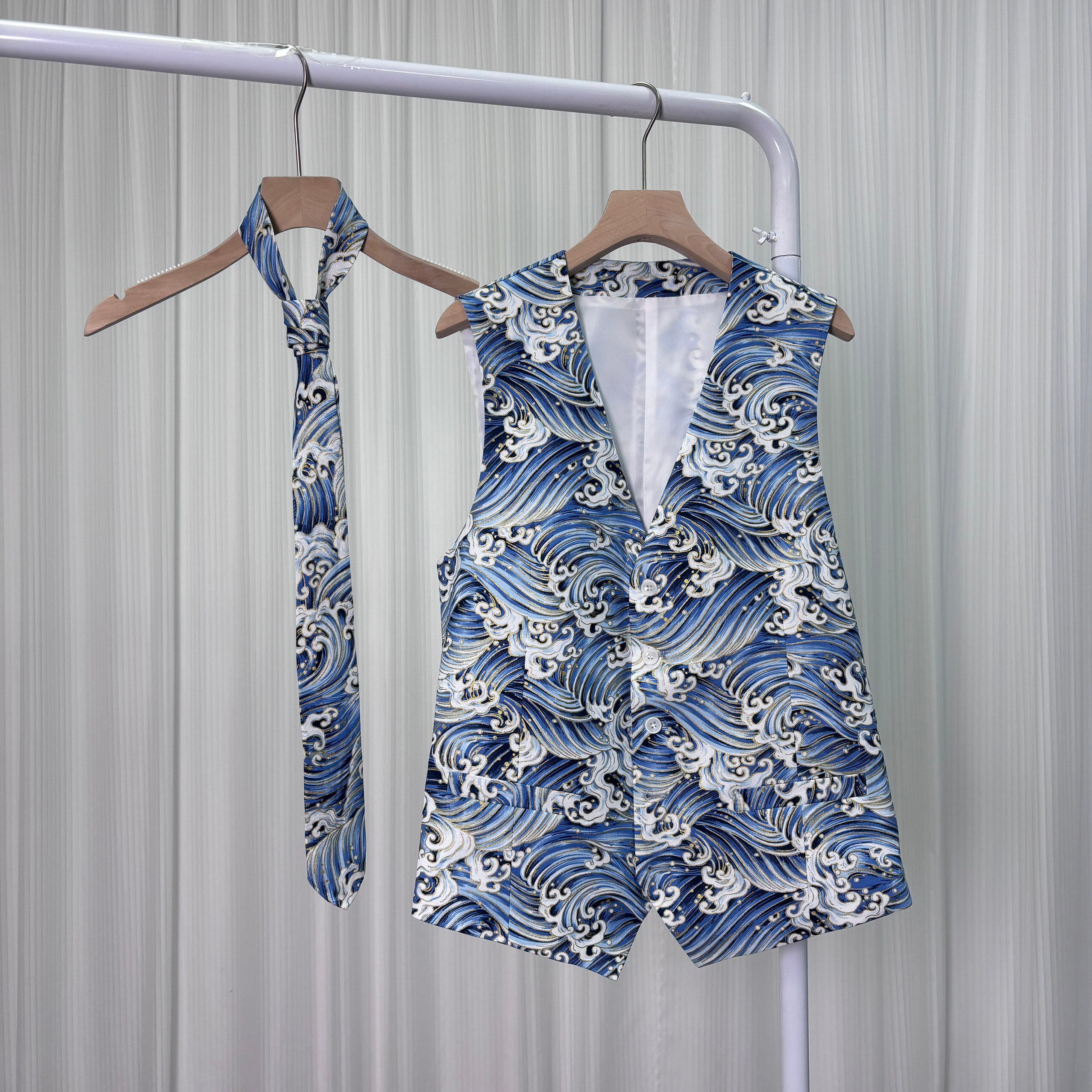 和柄 ベスト ネックタイ ブルー 新郎衣装
