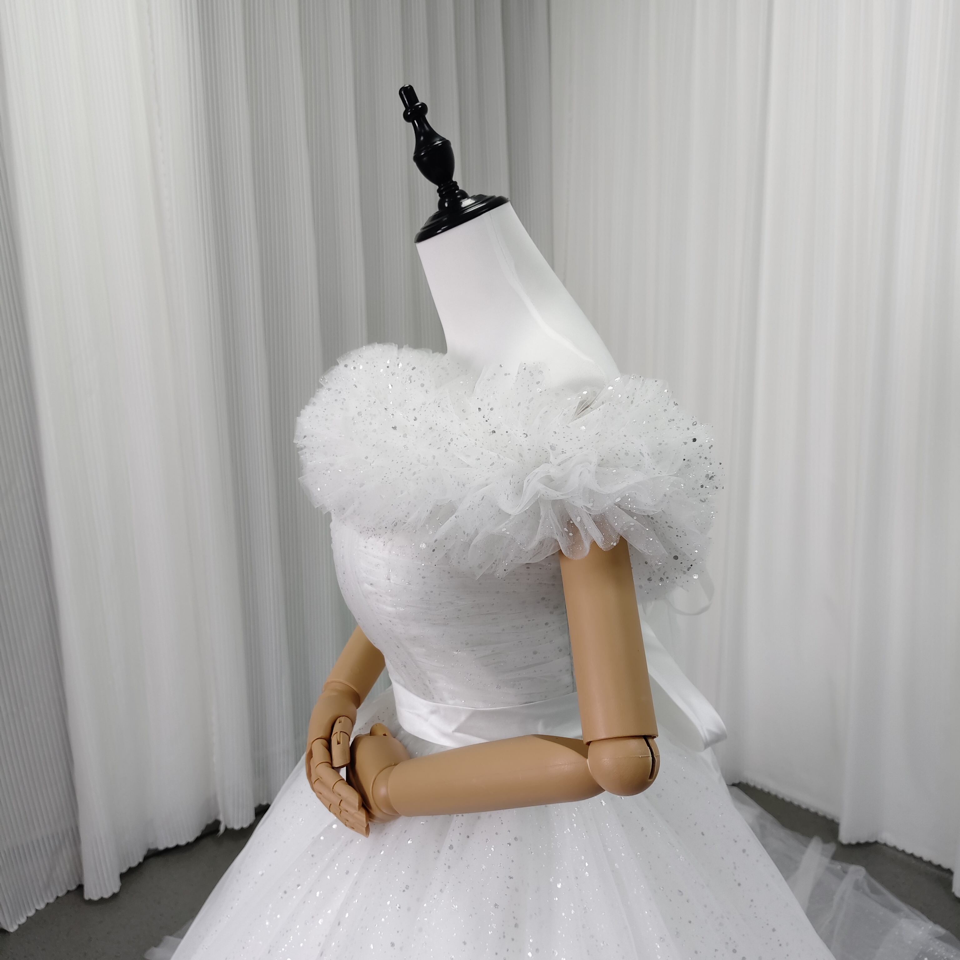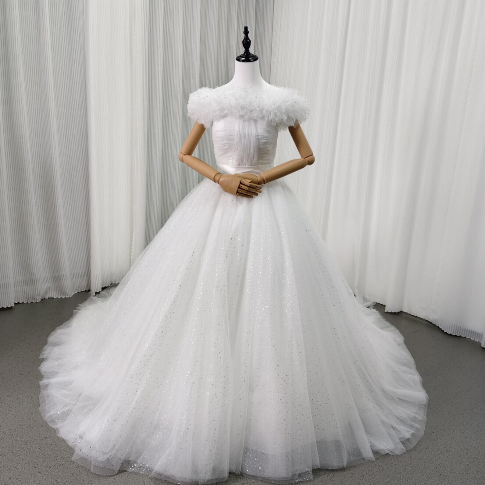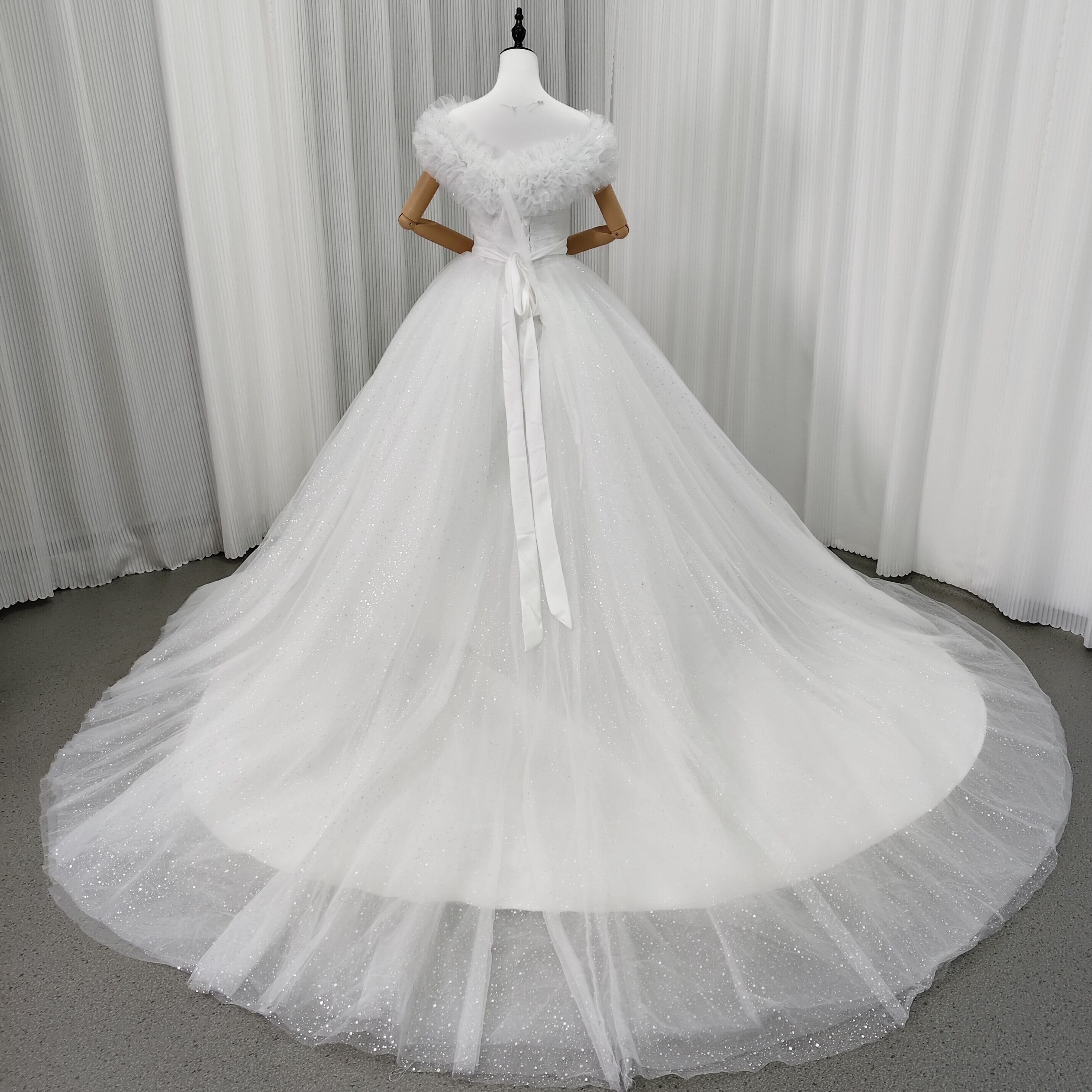 ウエディングドレス オフショルダー チュールスカート 編み上げ 前撮り サッシュベルト ハンドドレープ