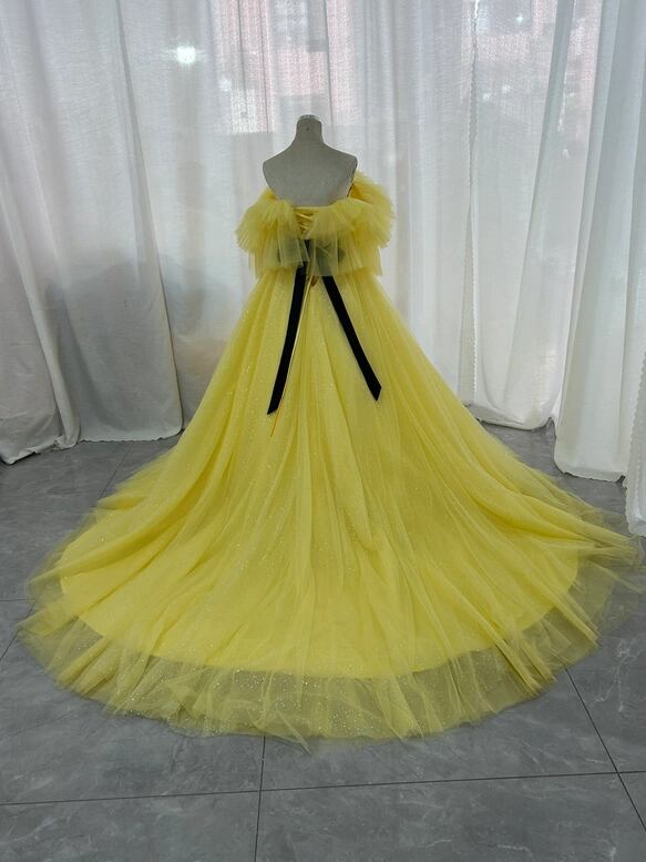 カラードレス イエロー オフショルダー キラキラチュール サッシュベルト ロングトレーン 披露宴