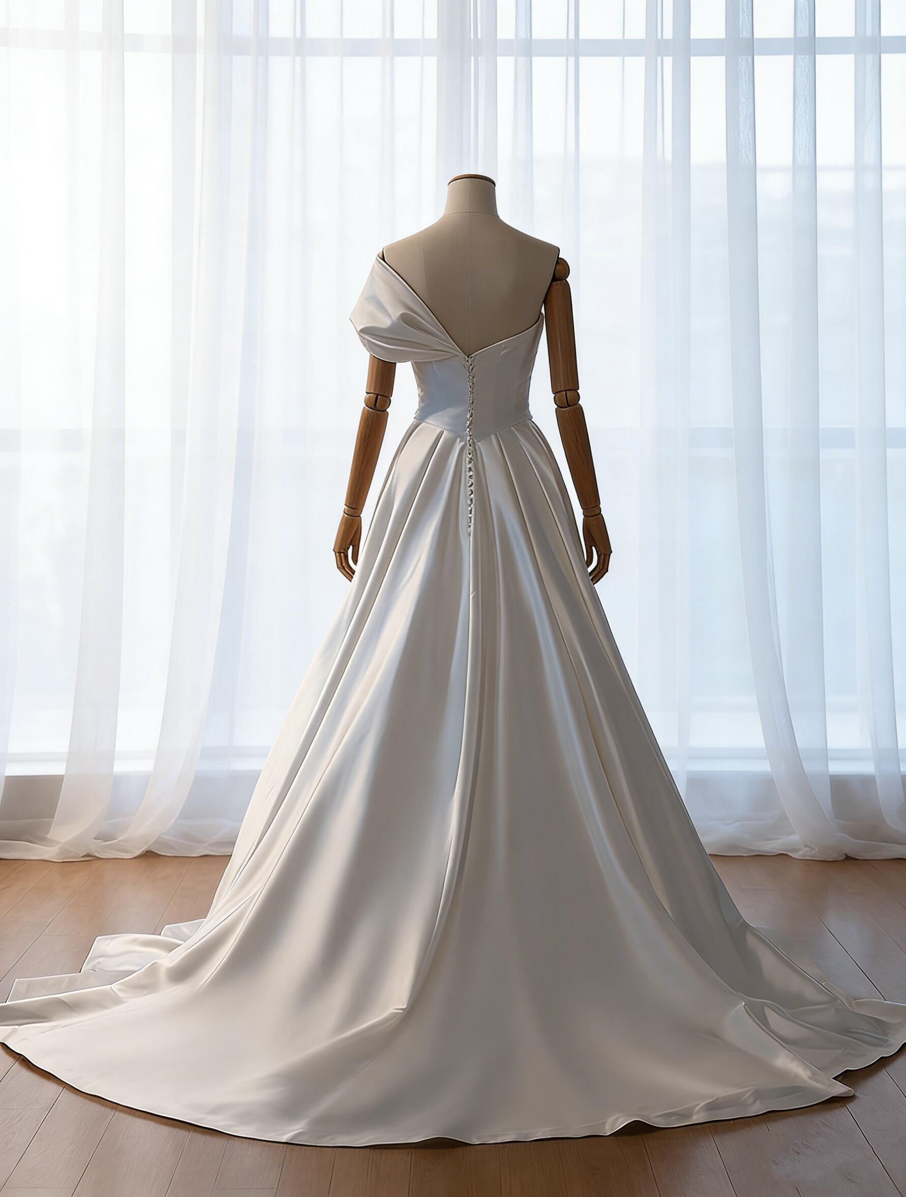 ウエディングドレス ワンショルダー くるみボタン 光沢サテン Aライン ラッフルフリル 結婚式/披露宴