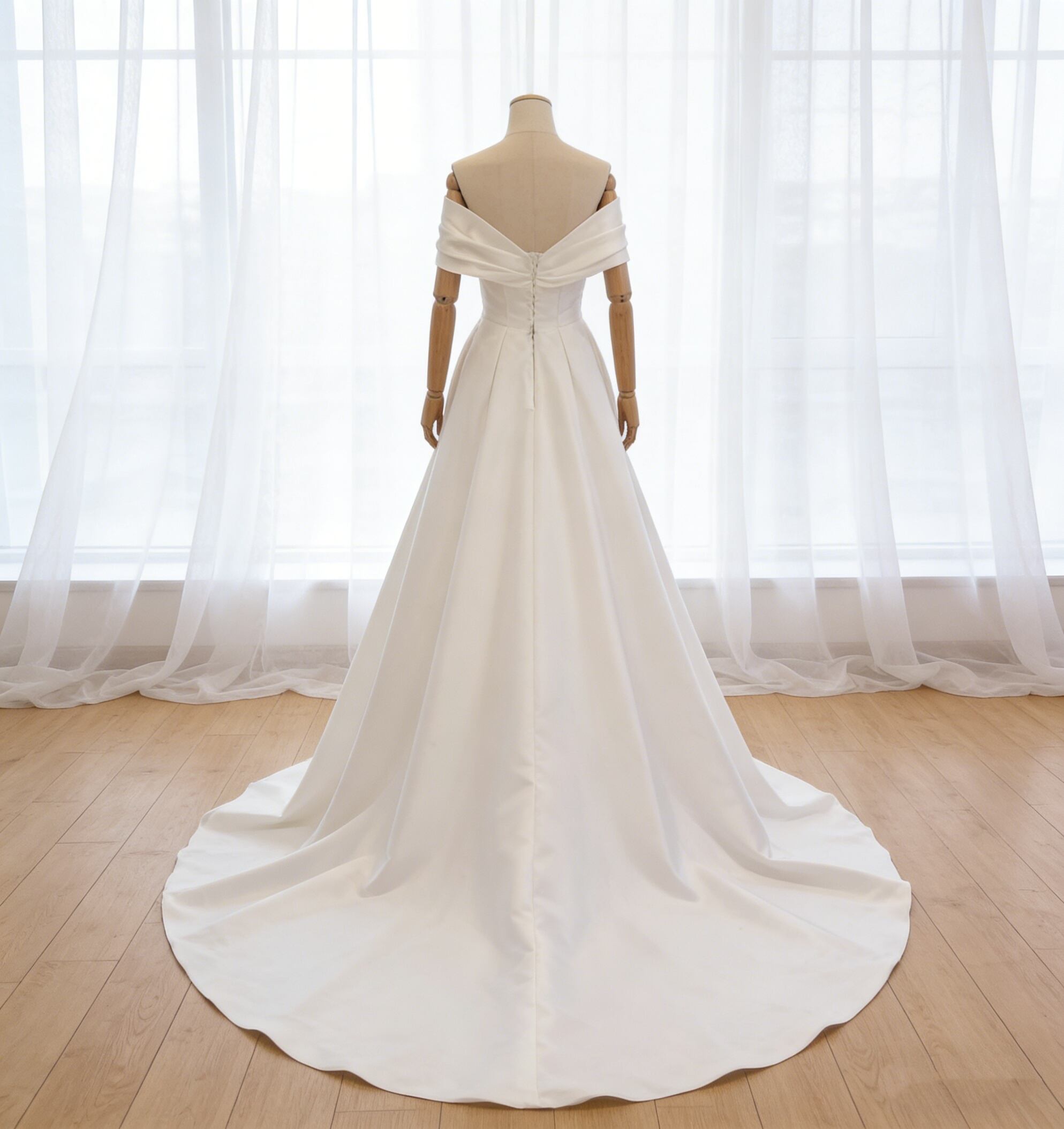 ウェディングドレス オフショルダー ハンドドレープ オフホワイト 編み上げ スレンダーライン 結婚式