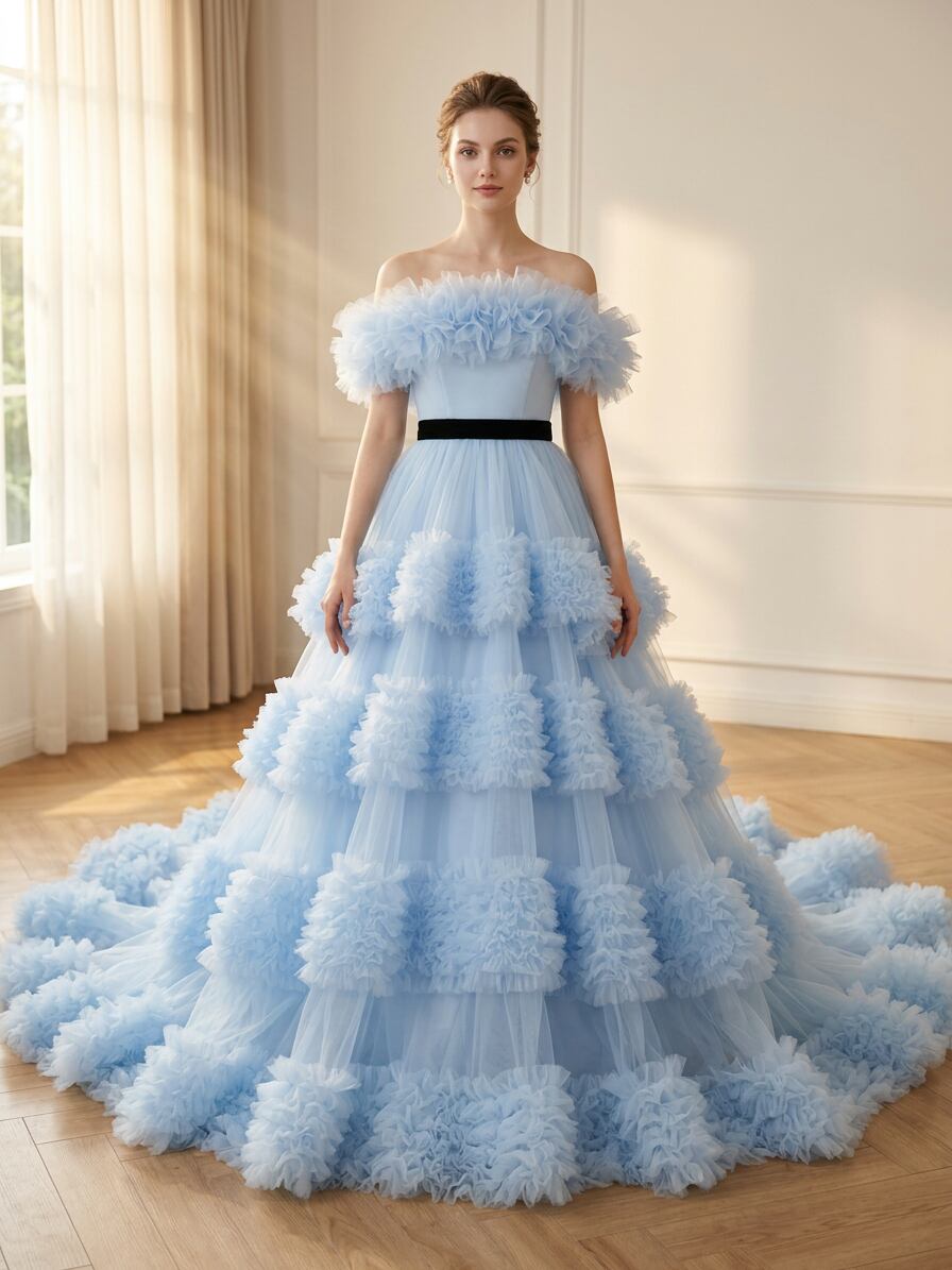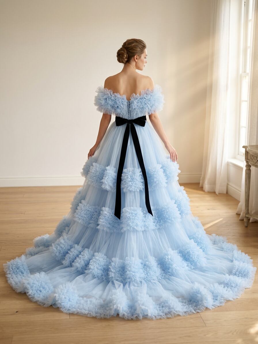 カラードレス ブルー 取り外し可能なオフショルダー ラッフルフリル 編み上げ プリンセスライン 前撮り ブライダル