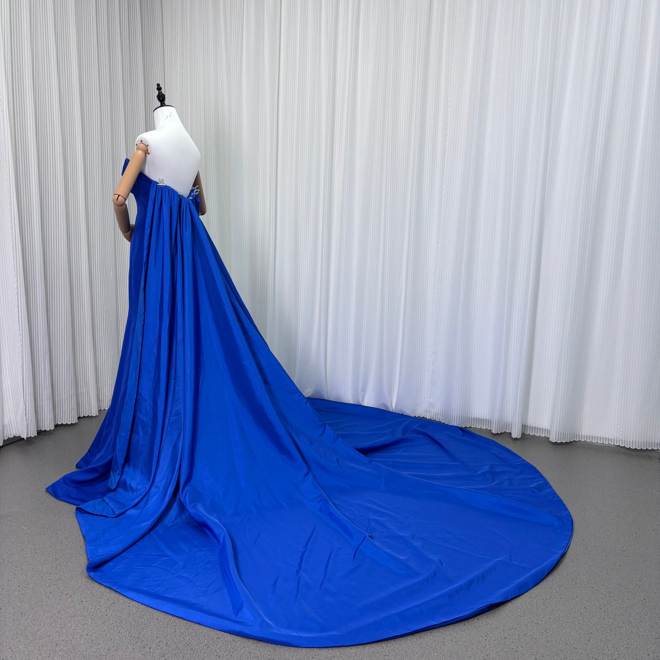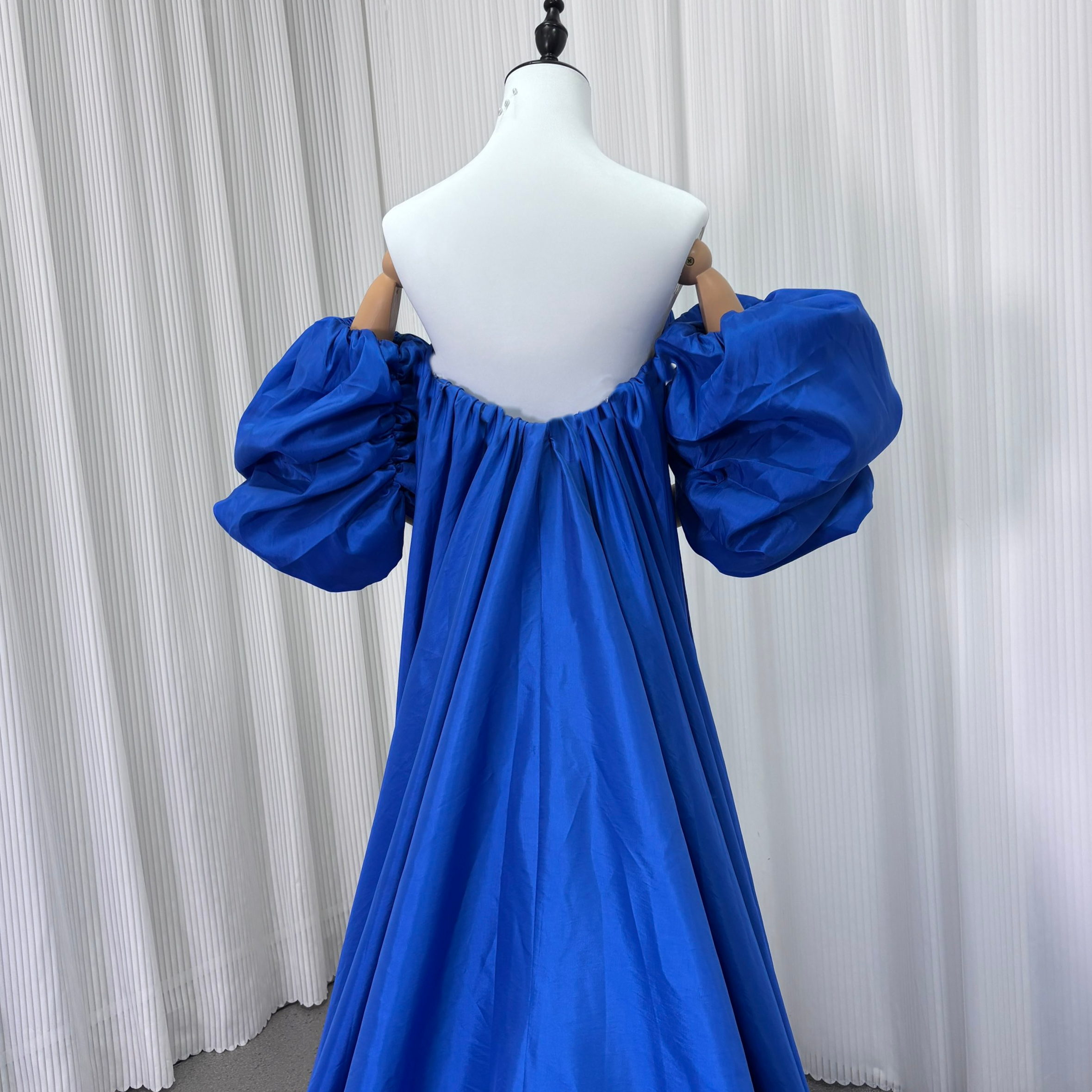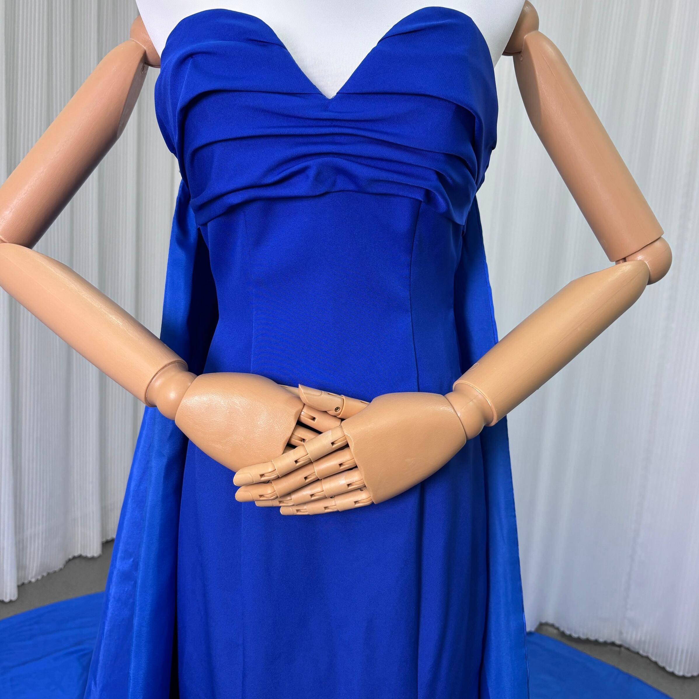 パーティードレス マーメイドライン パフスリーブドレス ハンドドレープ ブルー 編み上げ ロングトレーン