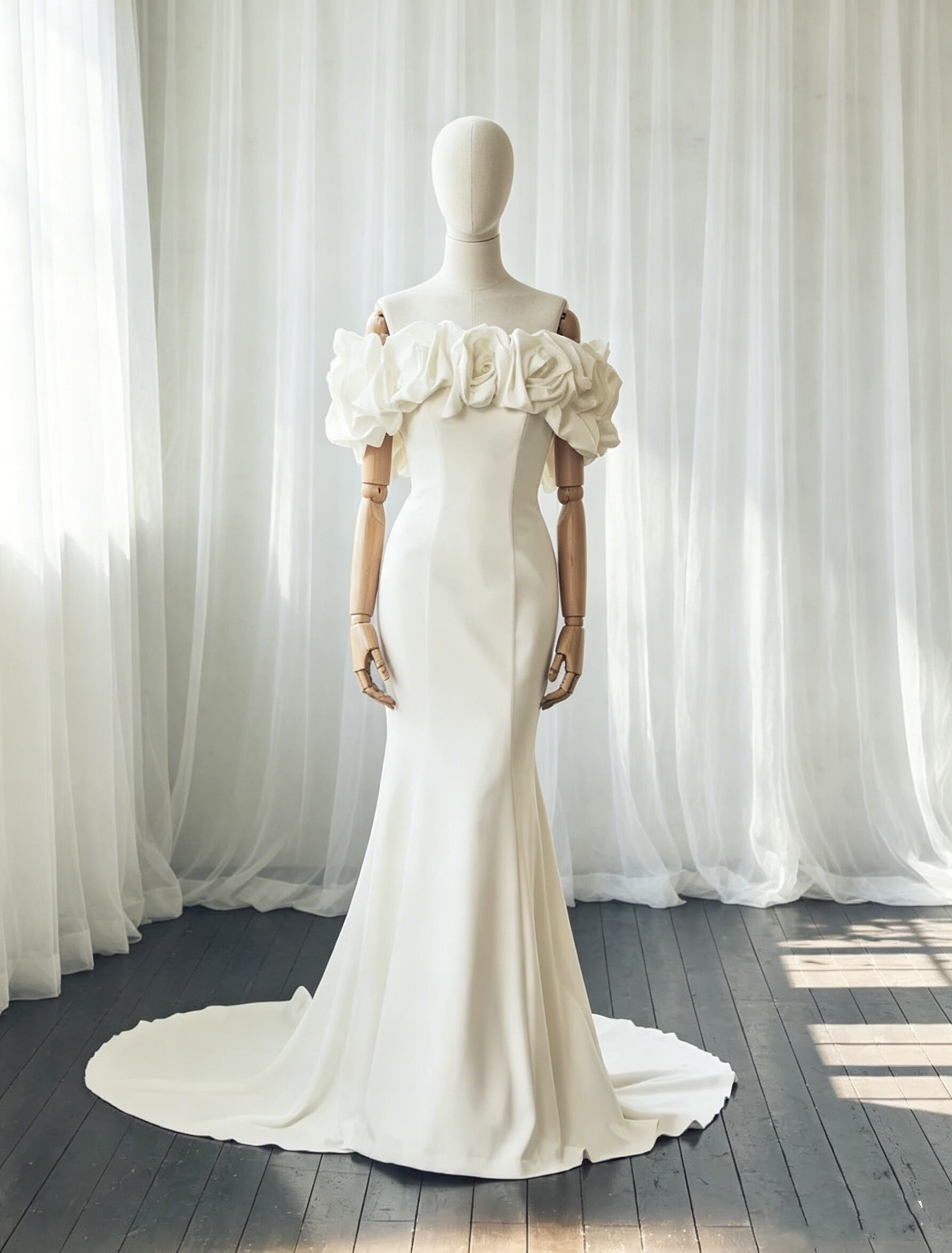 パーティードレス オフショルダー クレープ生地 マーメイドライン 優雅なシルエット オフホワイト 前撮り
