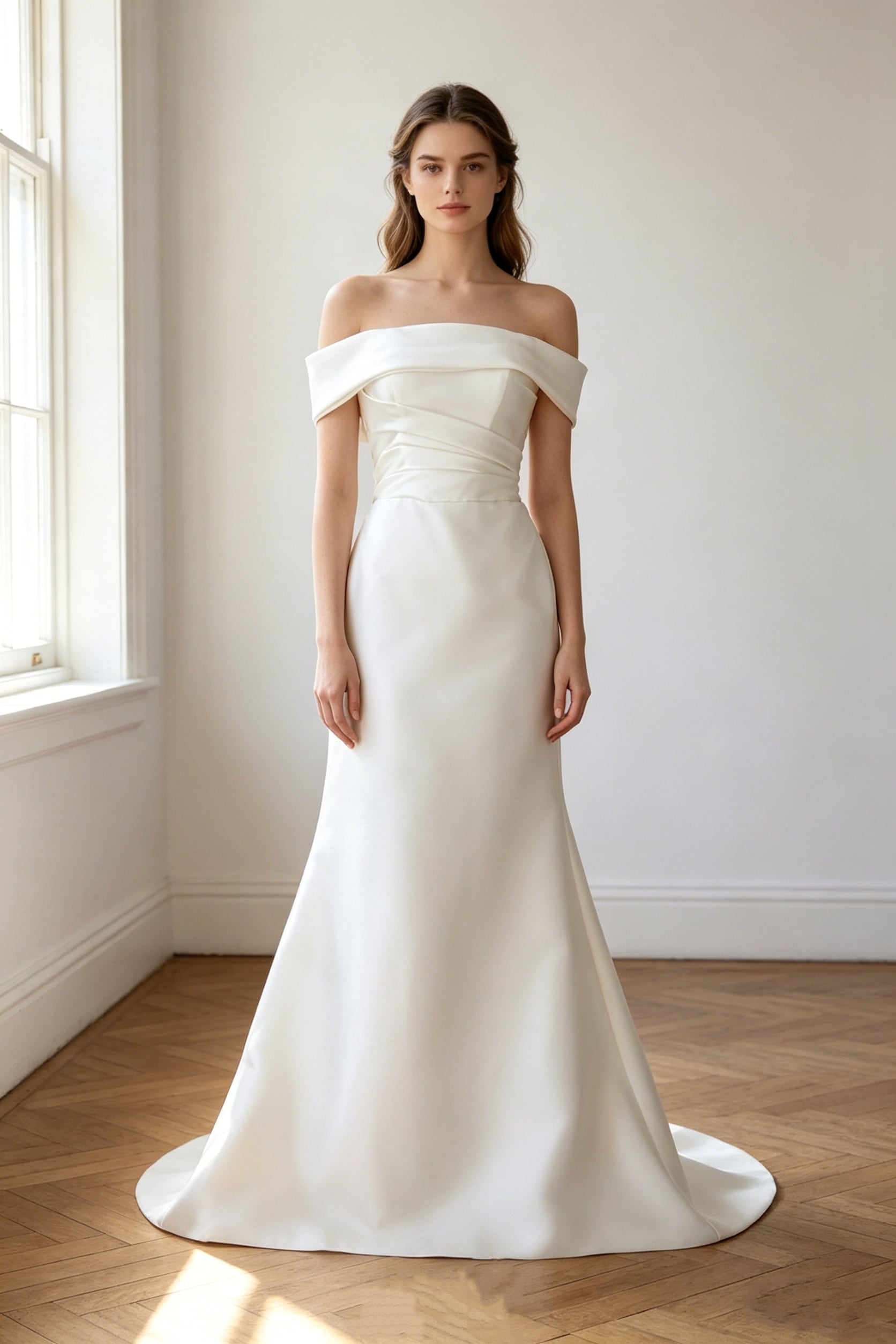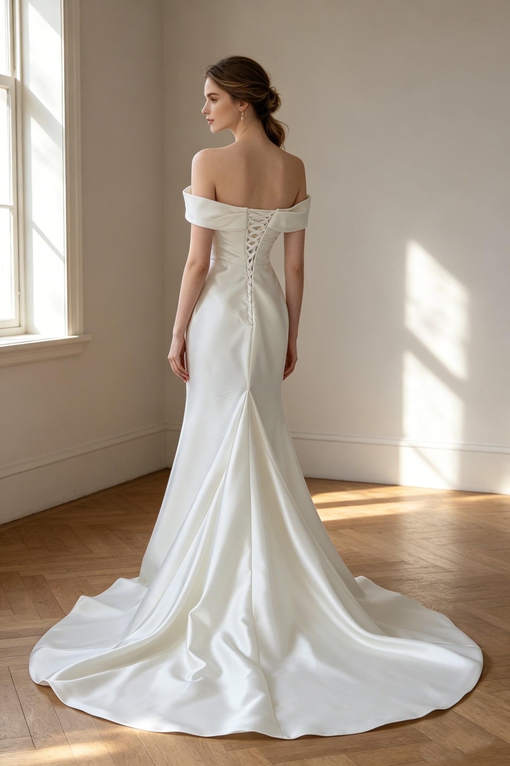 パーティードレス オフショルダー 編み上げ マーメイドライン オフホワイト 結婚式 細見えシルエット 前撮り
