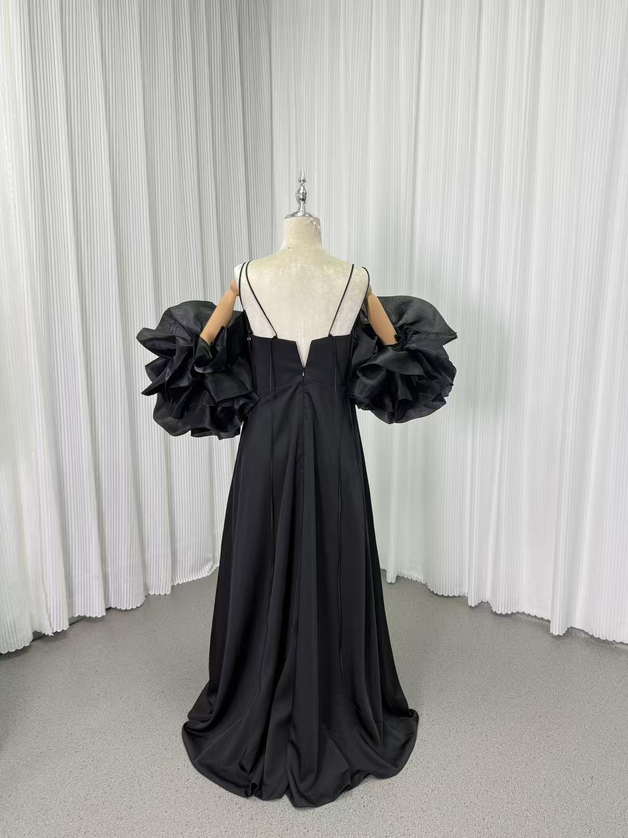 パーティードレス キャミソール フリル袖 ファスナー 床付く Vネックドレス ブラック 高品質イタリアサテン