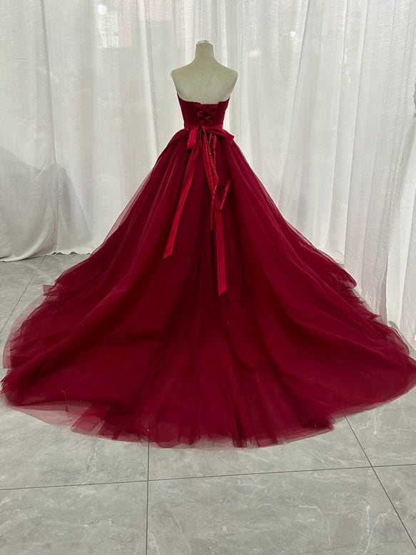 カラードレス ワインレッド ベアトップ サッシュベルト チュールスカート ロングトレーン 編み上げ 二次会