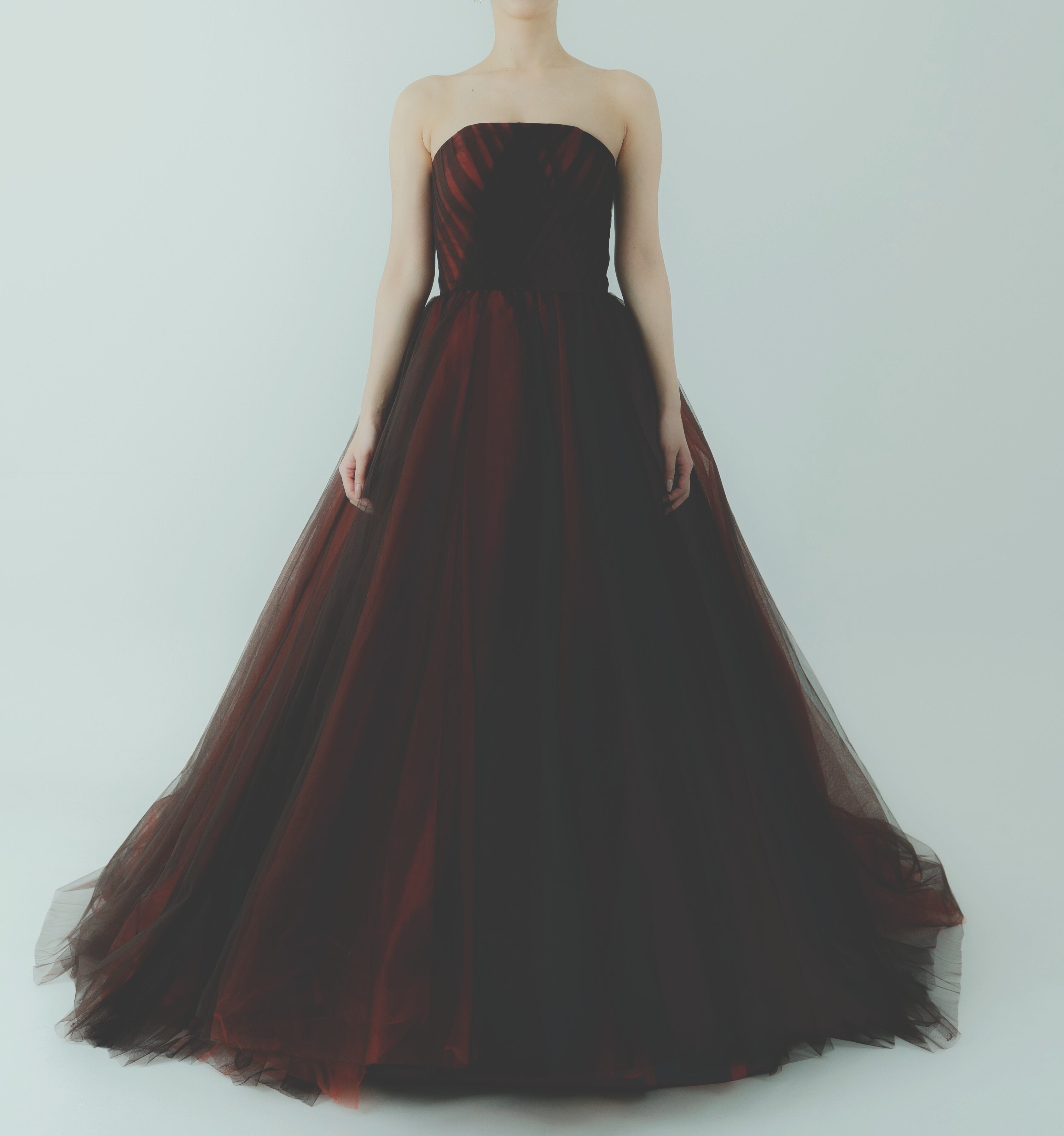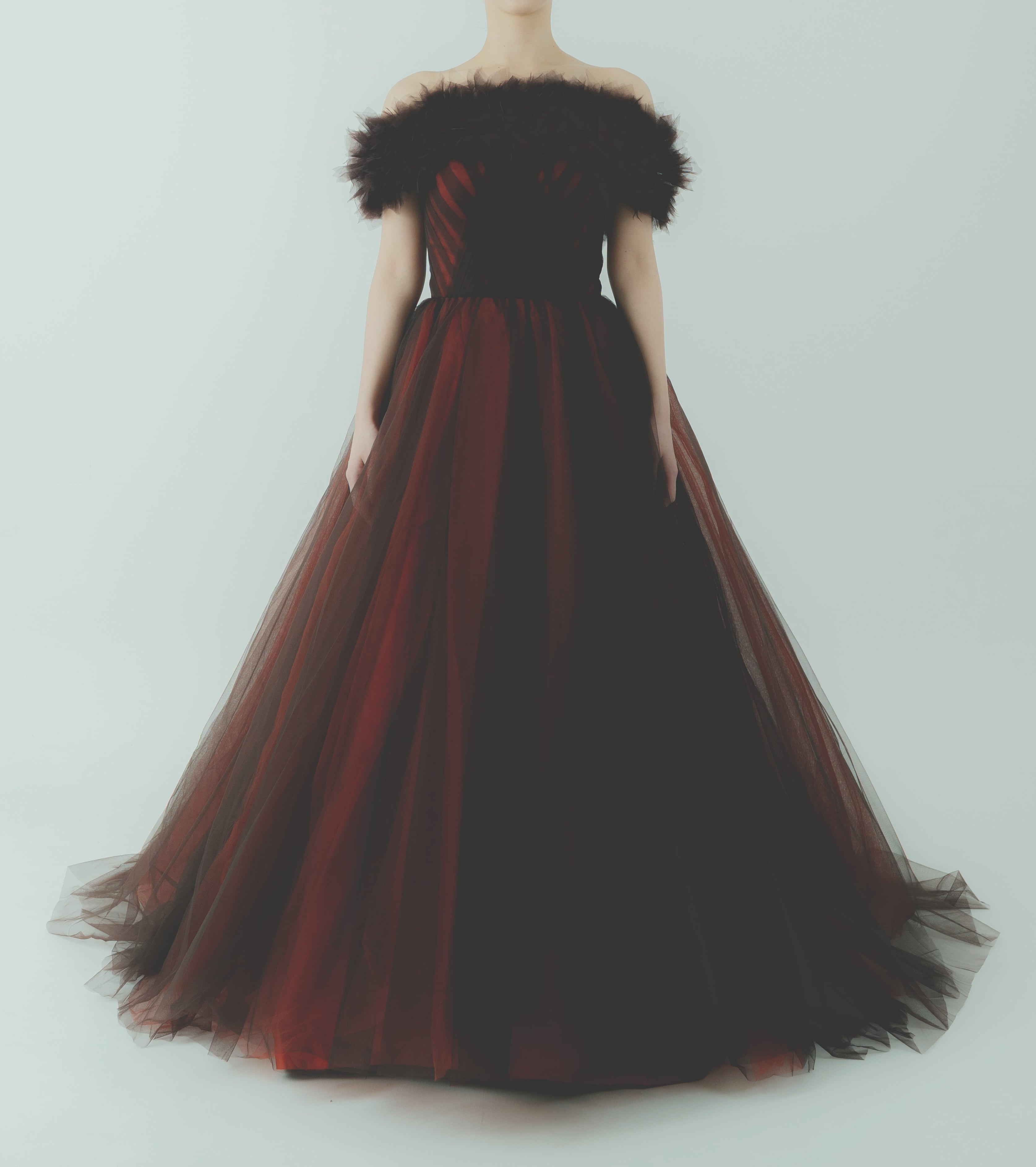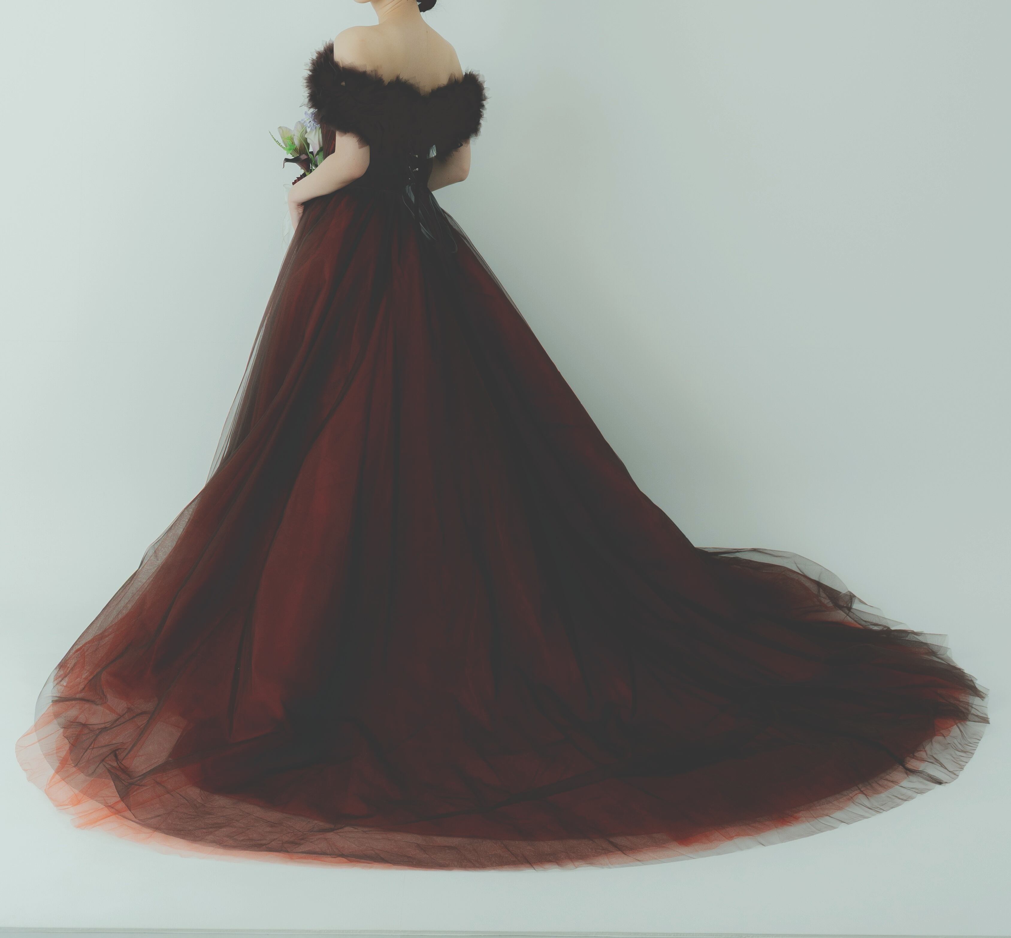 カラードレス テラコッタ 取り外し可能なオフショルダー 編み上げ 柔らかく重ねたチュールスカート ブライダル 前撮り