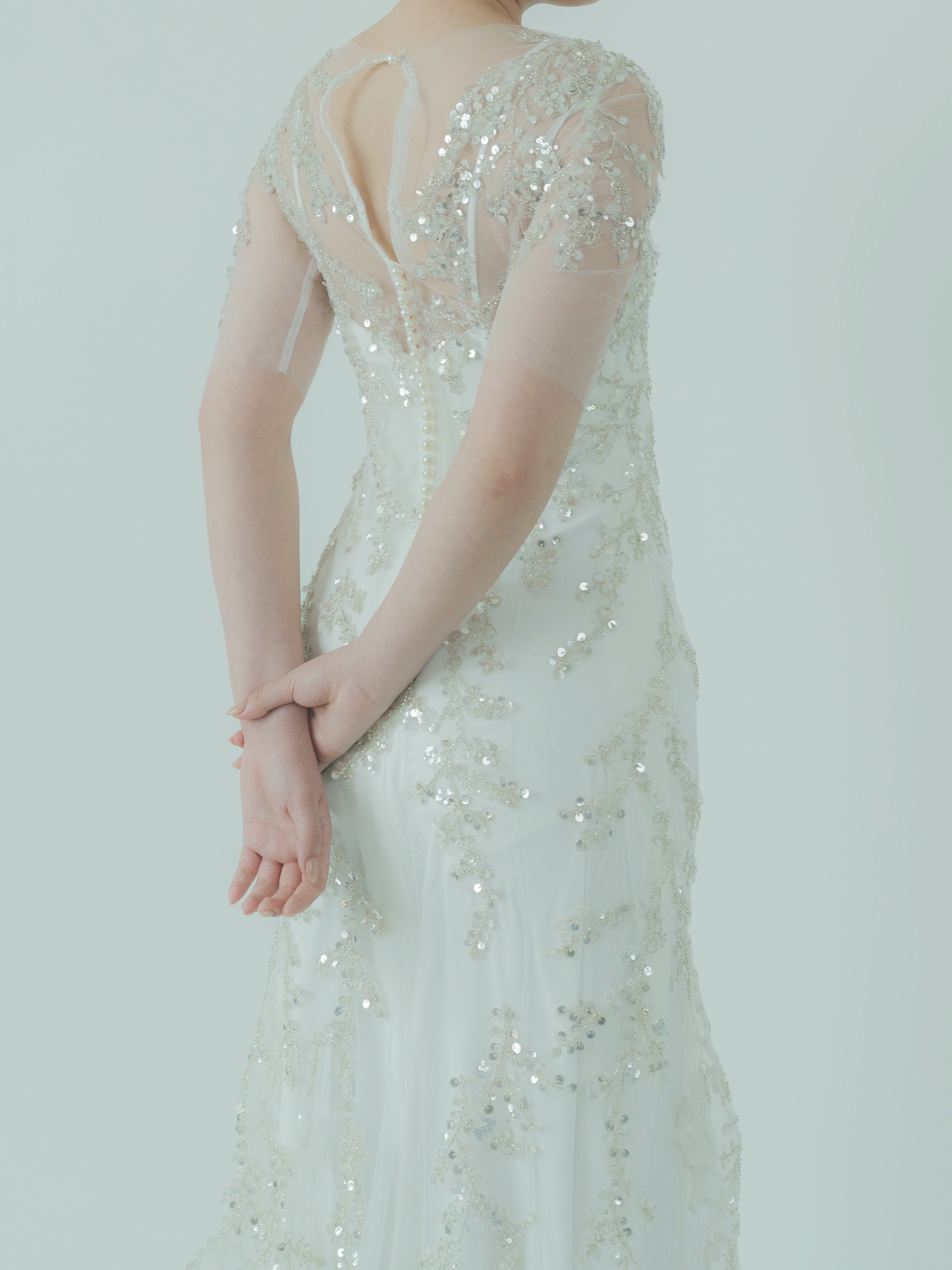 ウェディングドレス リーフ刺繍 インポートビジューレース 半袖 くるみボタン マーメイドライン 結婚式/披露宴