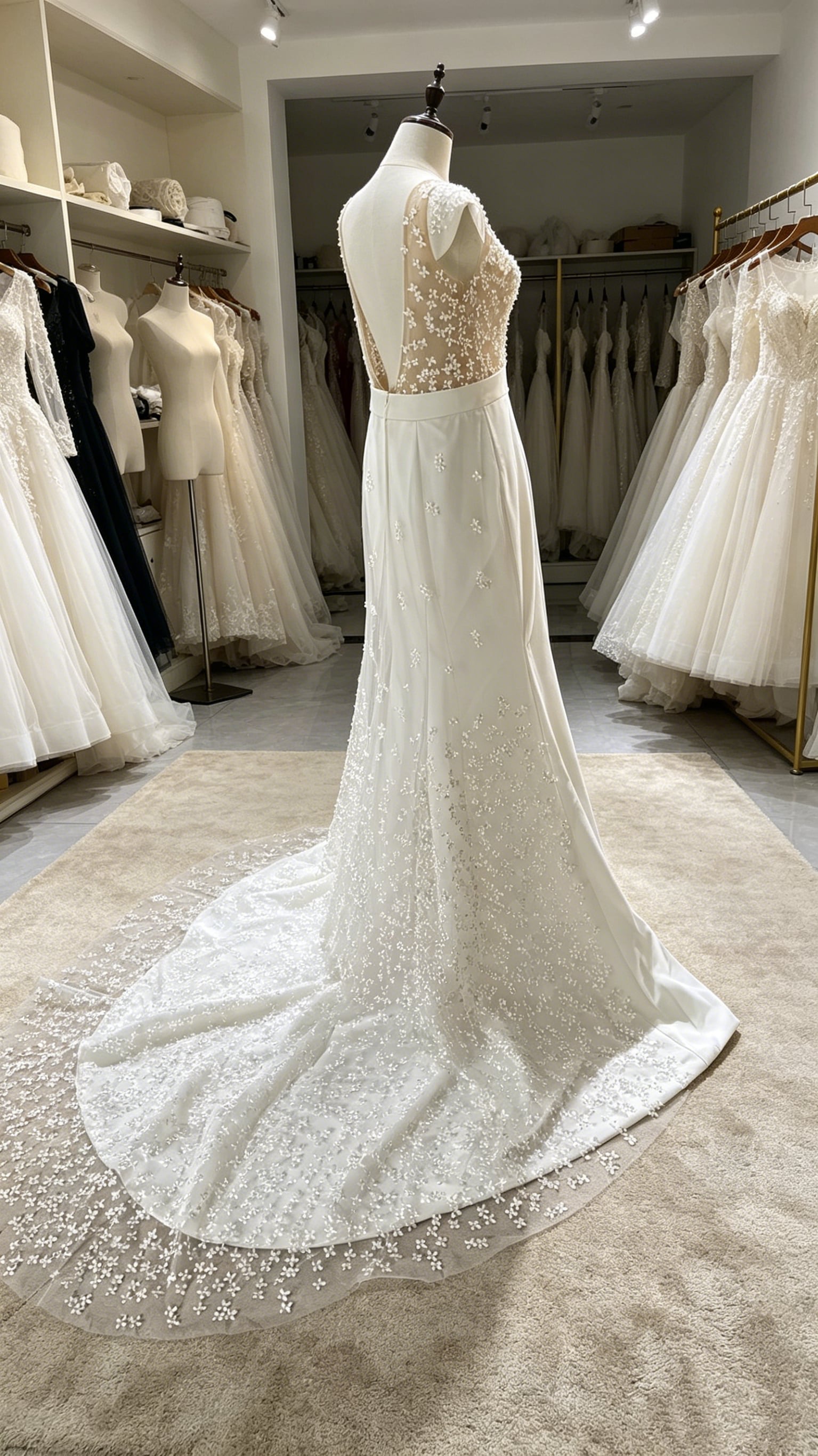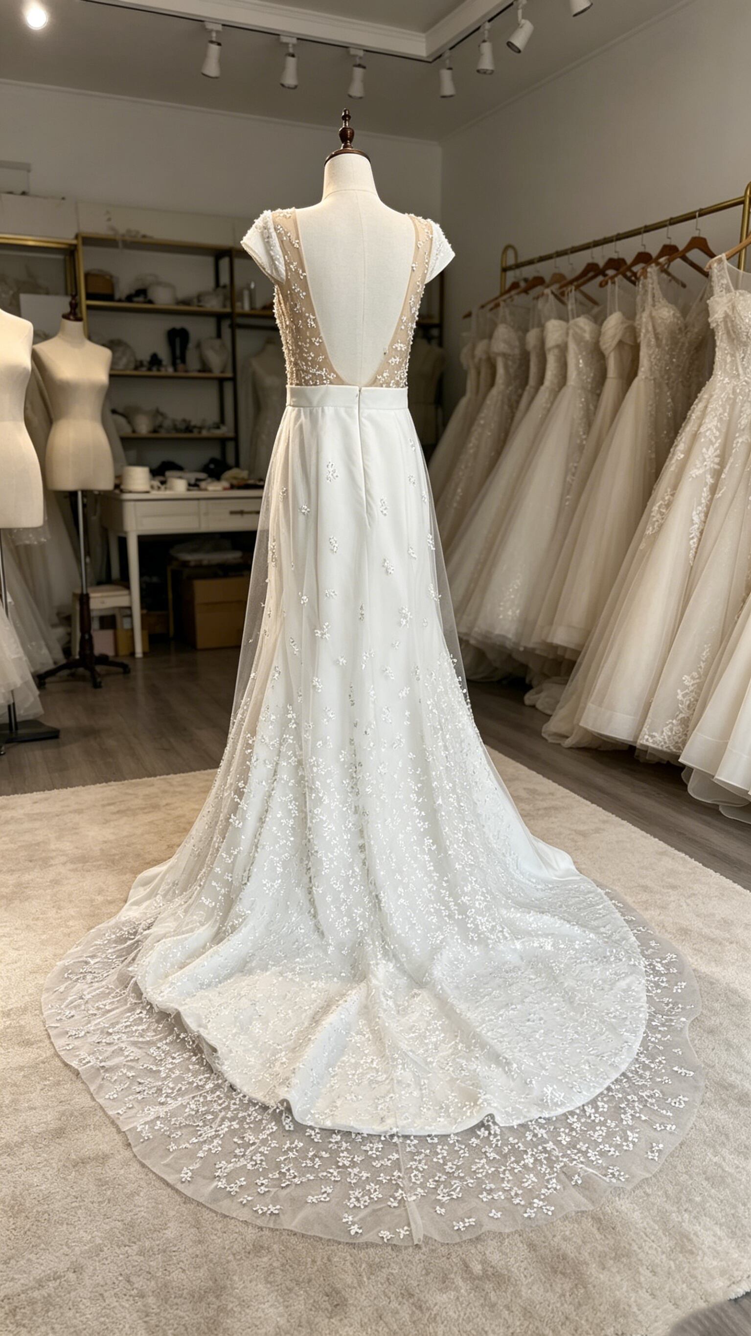 ウェディングドレス 花モチーフ マーメイドライン 背中見せ 半袖 ハンドメイド ブライダル 優雅なシルエット