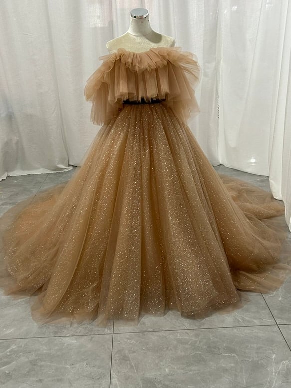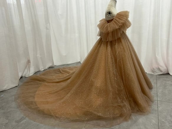 カラードレス シャンパン色 オフショルダー キラキラチュール ロングトレーン 編み上げ 花嫁 披露宴