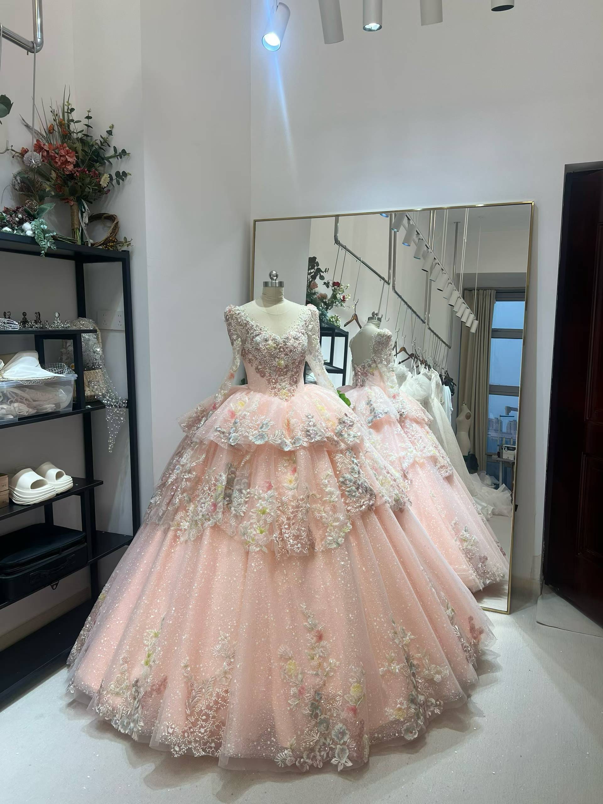 カラードレス プリンセスライン 3D立体レース刺繍 ロングスリーブ ピンク 抜群におしゃれ度が際立つ 上品な花レース 花嫁