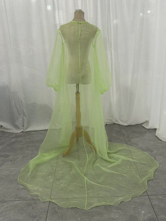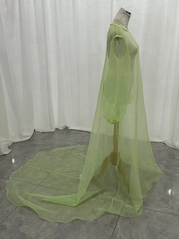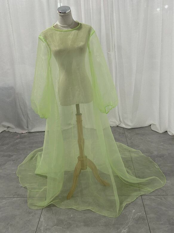 人気上昇!薄 グリーン カラードレス 上質オーガンジー ロングトレーン オーバースカート 結婚式