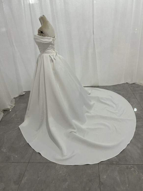 人気上昇!オフホワイト ウエディングドレス 両面サテン 袖 華やかなトレーン 挙式/前撮り/結婚式