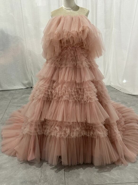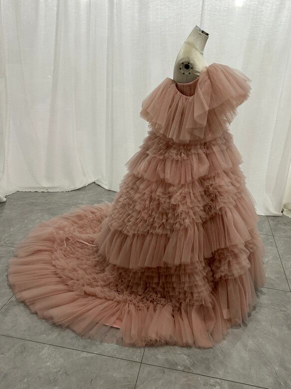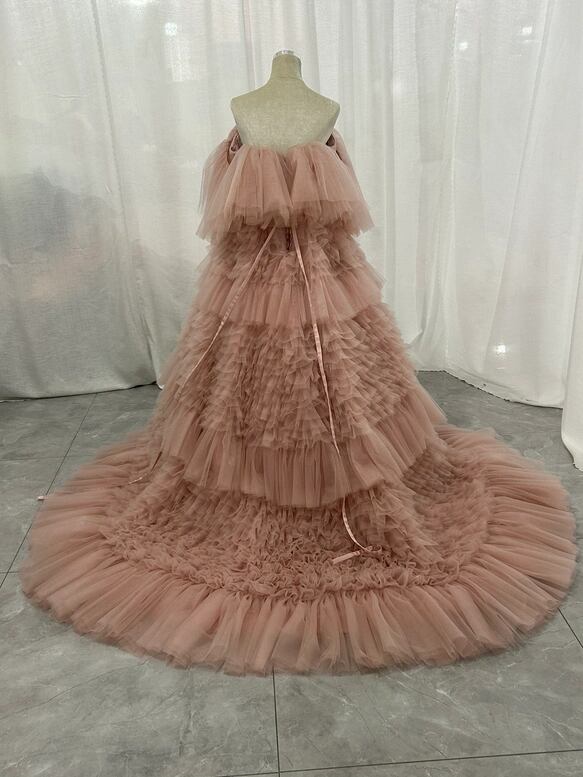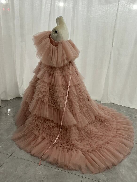 韓国風 ピンクカラードレス チュールドレス フリルオフショルダー お色直し ふわふわ もこもこドレス